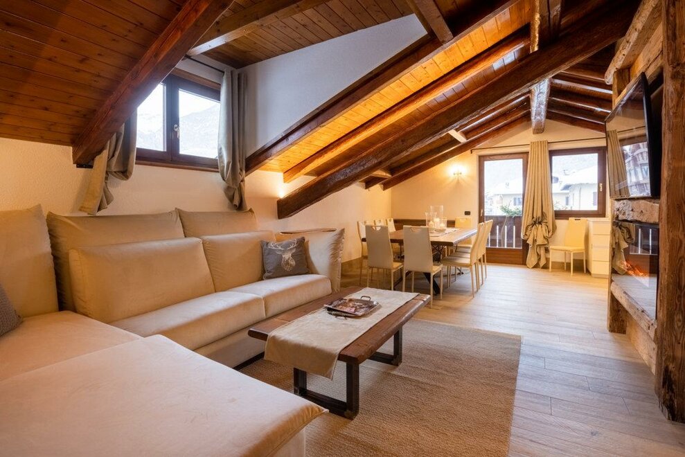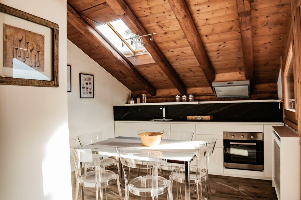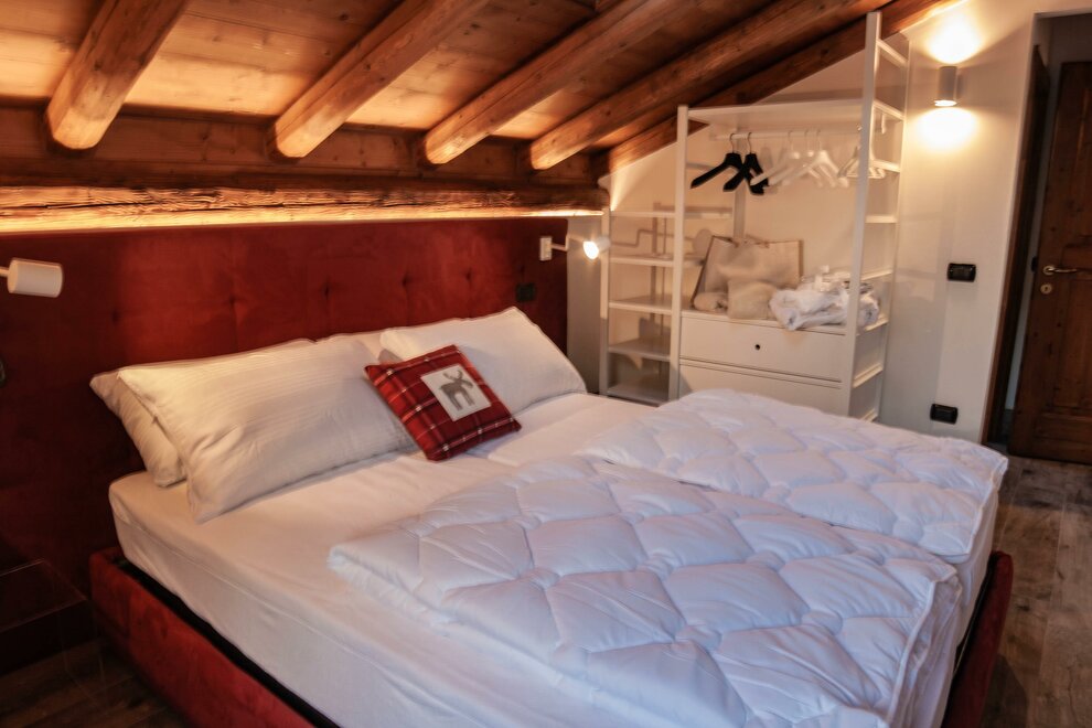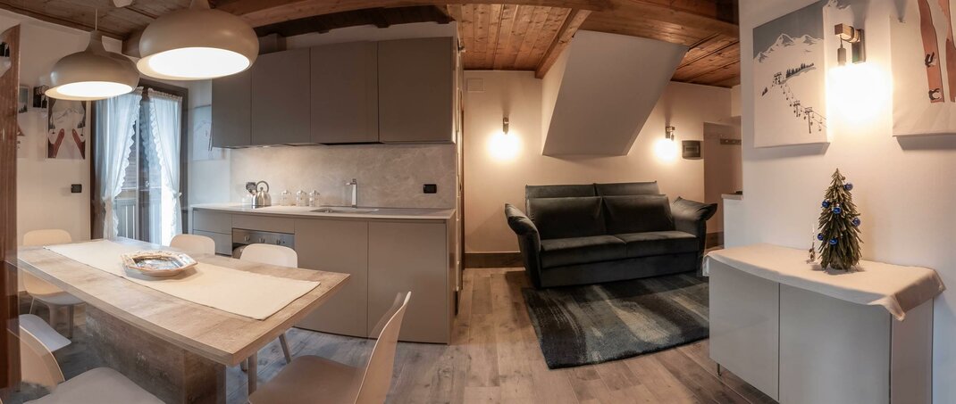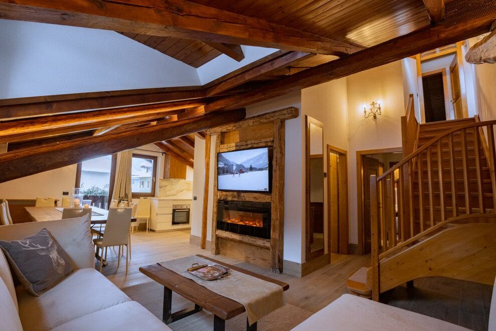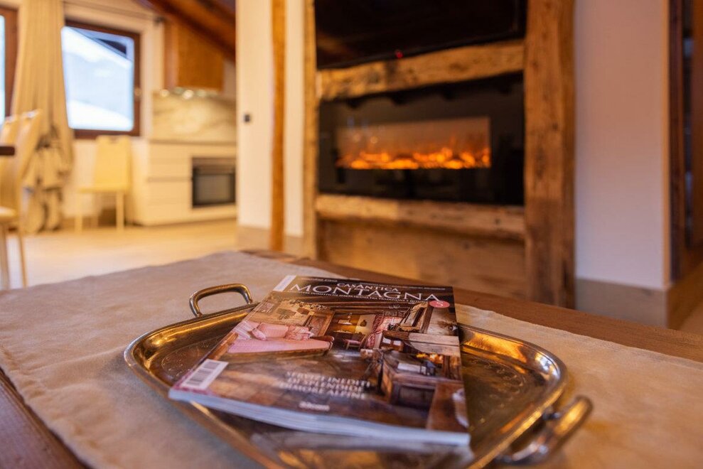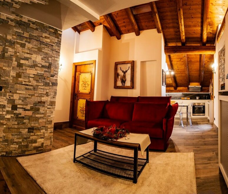L’appartamento Rubino è stato studiato con i materiali tradizionali che restano i protagonisti in montagna: il legno e la pietra.