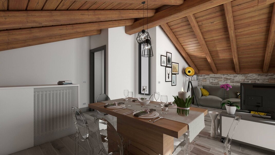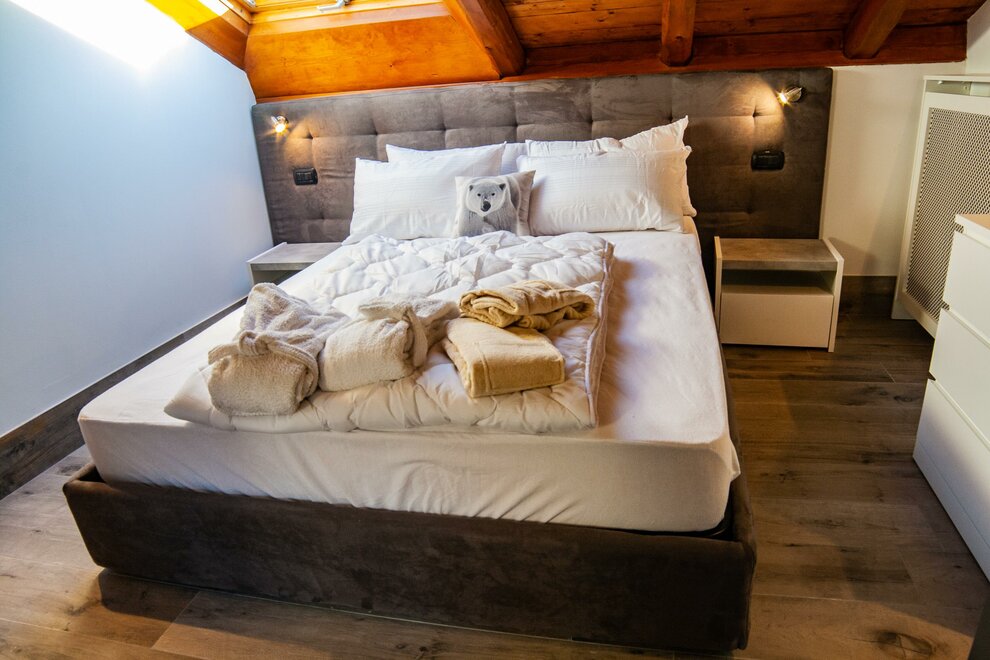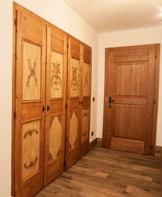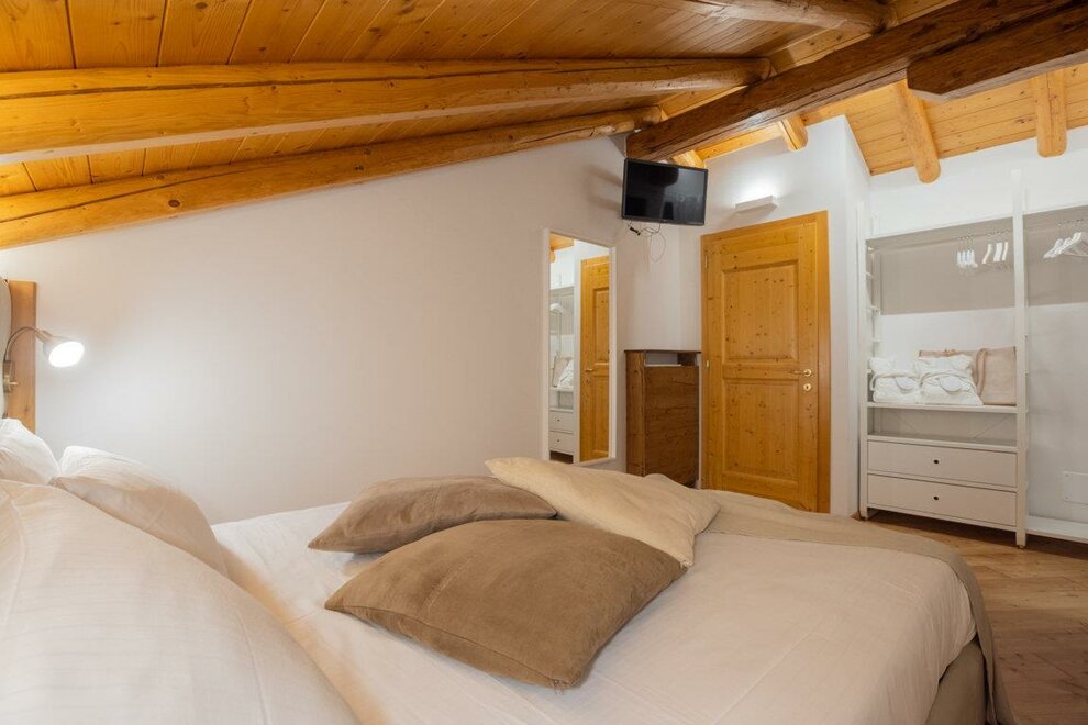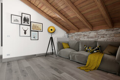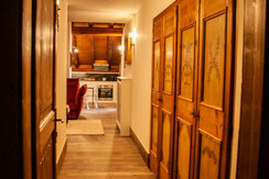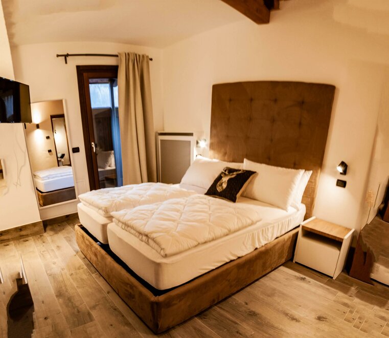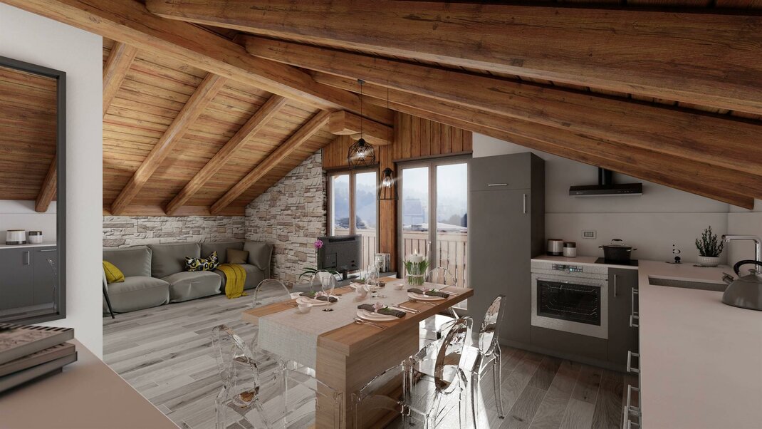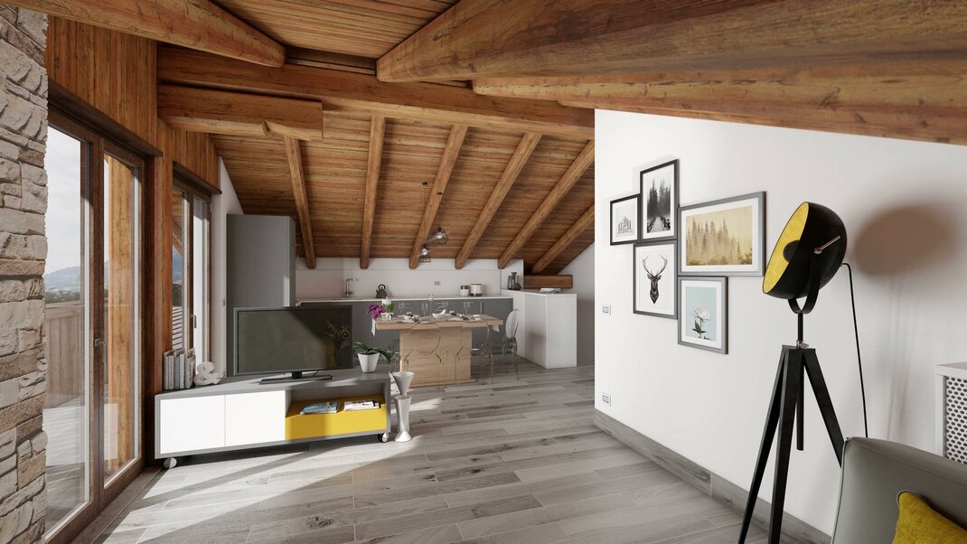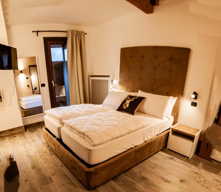 L’appartamento Rubino è stato studiato con i materiali tradizionali che restano i protagonisti in montagna: il legno e la pietra.