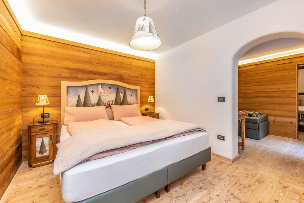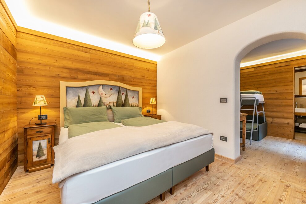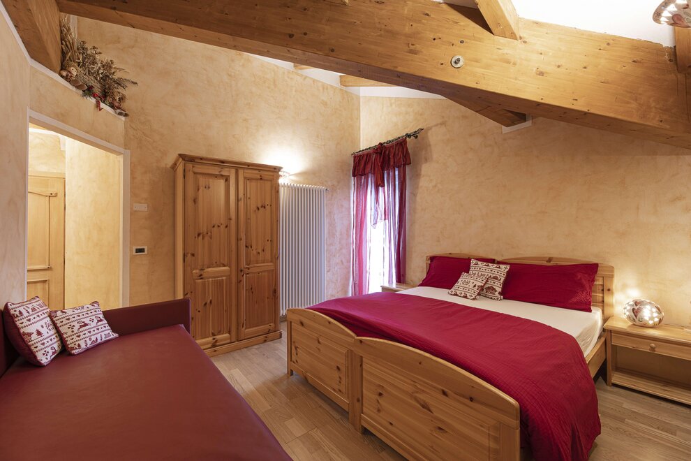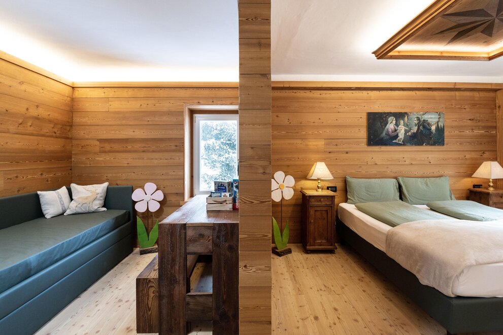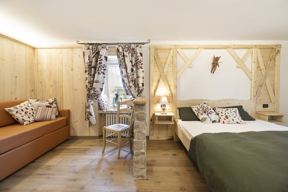 Ampia stanza da letto, dotata di letto matrimoniale e divano letto, che all’occorrenza si trasforma in letto a castello, adattandosi così alle esigenze di una famiglie, o di un gruppo di amici. Bagno privato in camera con doccia e asciugacapelli . L’arredamento in legno locale e la pavimentazione in larice naturale danno una piacevole sensazione di calore. A disposizione un ampio e panoramico balcone privato in legno. Superficie a partire dai 23 metri quadri. Abbiamo scelto di farvi vivere un’esperienza davvero rigenerate anche per la mente, per questo nelle nostre stanze troverete un kit di giochi e attività da fare insieme a chi vi accompagna, per questa ragione è assente la Tv.