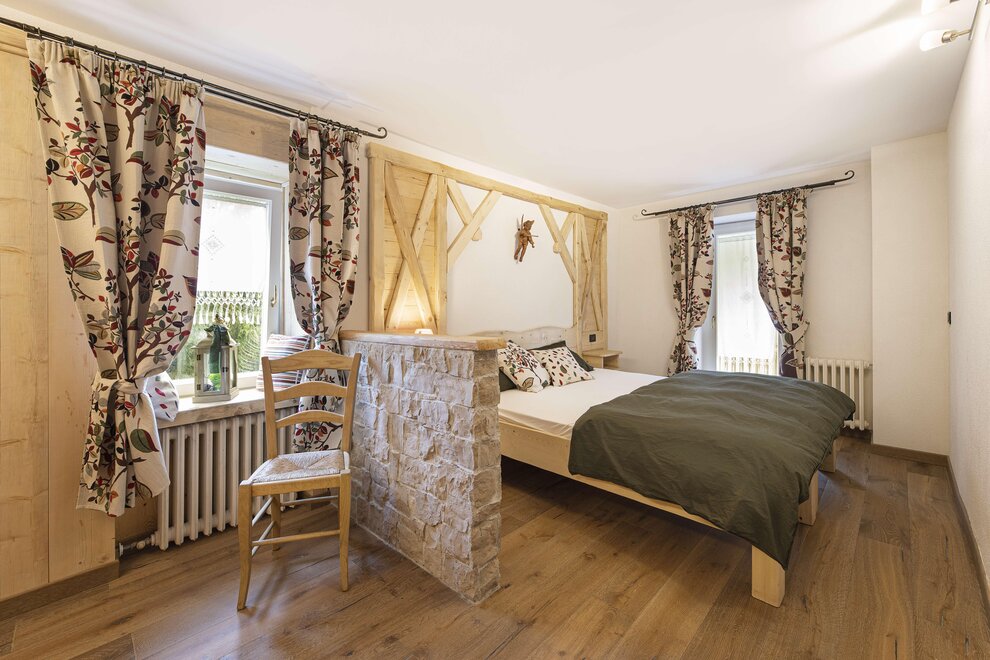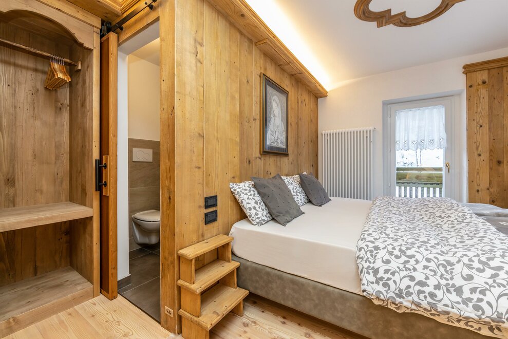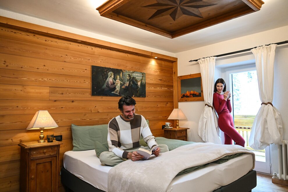 Stanza matrimoniale, dedicata alle coppie, non è possibile avere due letti separati. Su richiesta possibilità di aggiunta di una culla. ll bagno dispone di doccia. Soleggiato poggiolo privato, su cui rilassarsi. Arredamento in legno e pavimentazione in legno di larice naturale, per un piacevole confort. Armadio e riscaldamento. Superficie di stanza e bagno:17 metri quadrati. Abbiamo scelto di farvi vivere un’esperienza davvero rigenerate anche per la mente, per questo nelle nostre stanze troverete un kit di giochi e attività da fare insieme a chi vi accompagna, per questa ragione è assente la Tv.