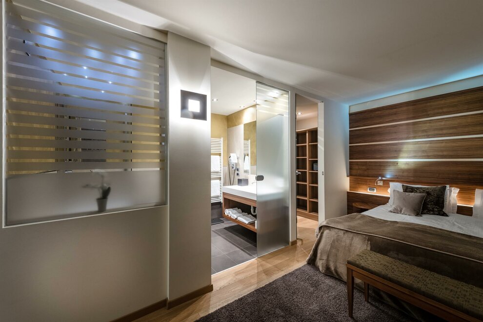 35 M² - 2-3 PERSONELa nostra Junior Suite Deluxe Panorama (35–40 m2) è un open space elegante e romantico con una vista privilegiata sul paesaggio circostante. Il bagno, arredato con gusto moderno e impreziosito da un’illuminazione artistica, dispone di vasca idromassaggio (alcune) e doccia.