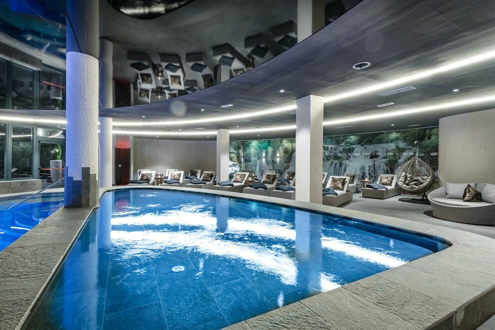La struttura comprende vari spazi dedicati al relax, tra cui un’innovativo centro benessere, che si estende per una superficie di oltre 1500 mq al cospetto di uno splendido ed esteso parco verde. Ne fanno parte una piscina per adulti interna ed esterna, varie tipologie di saune, zone suggestive dedicate al relax con diverse tipologie di lettini ed una zona beauty farm.