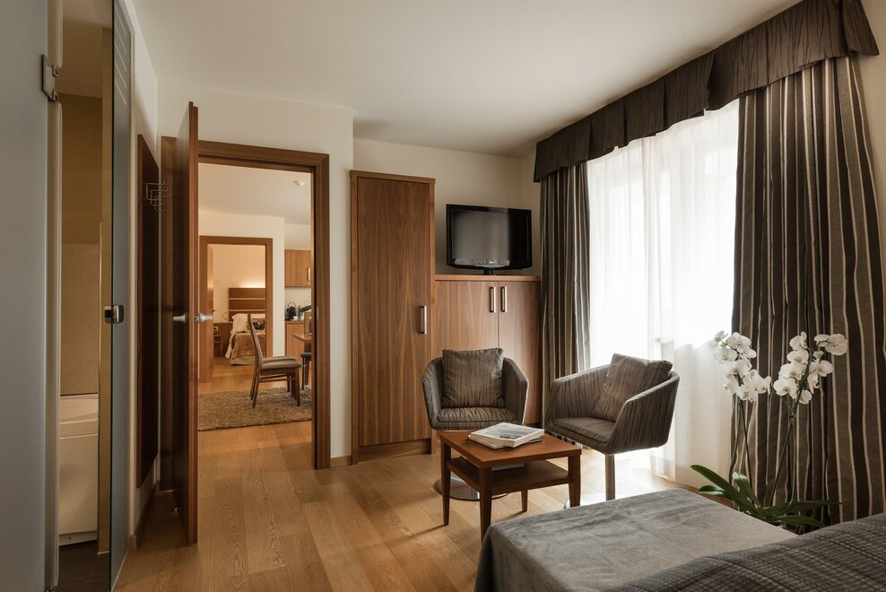 Angolo notte ed angolo living con divano letto e scrittoio sono illuminati da ampie finestre panoramiche. Tv-lcd, frigobar e cassaforte. Connessione internet disponibile.dotazioni camere/appartamenti