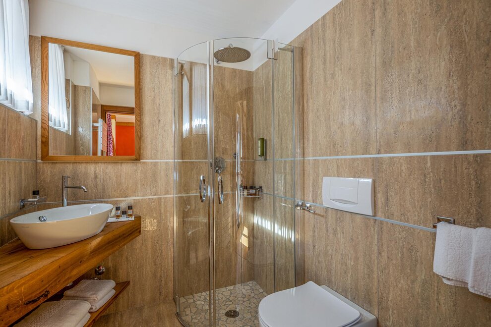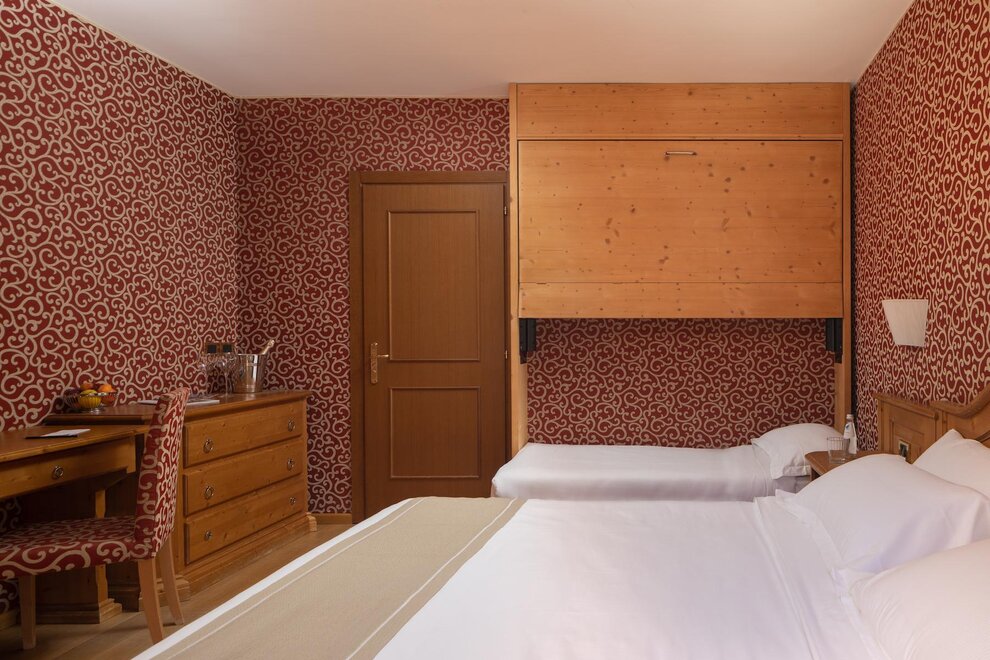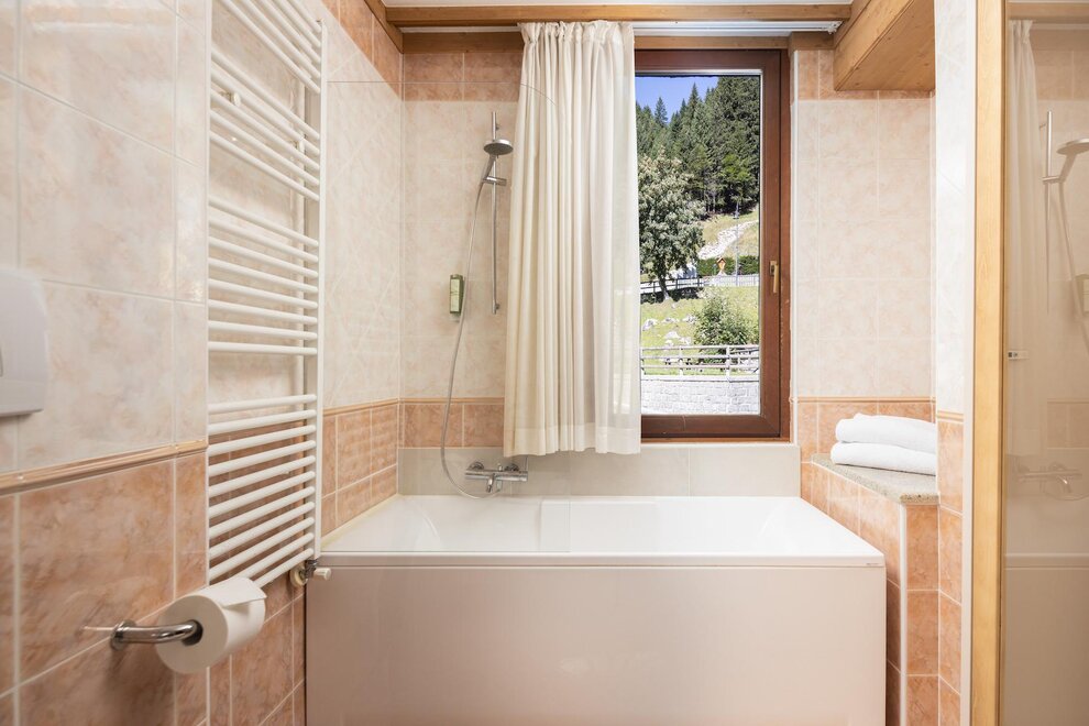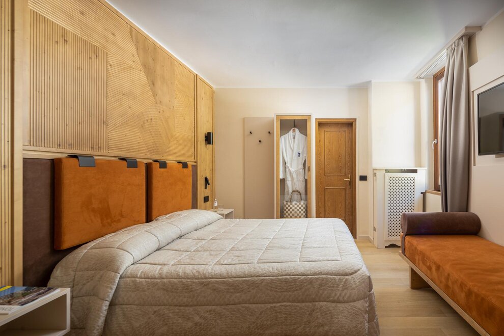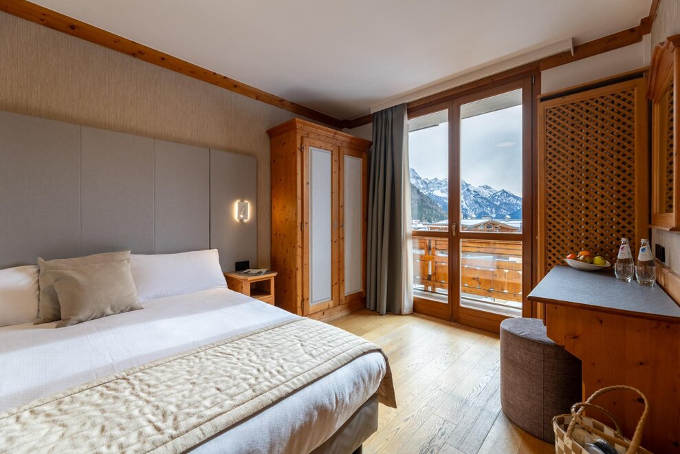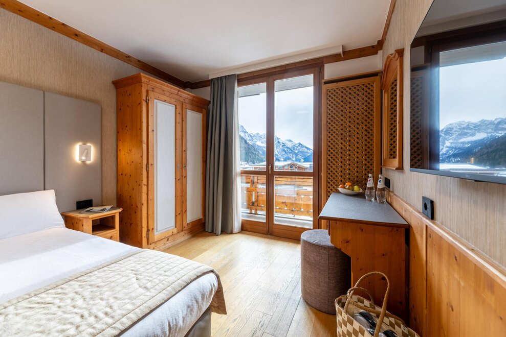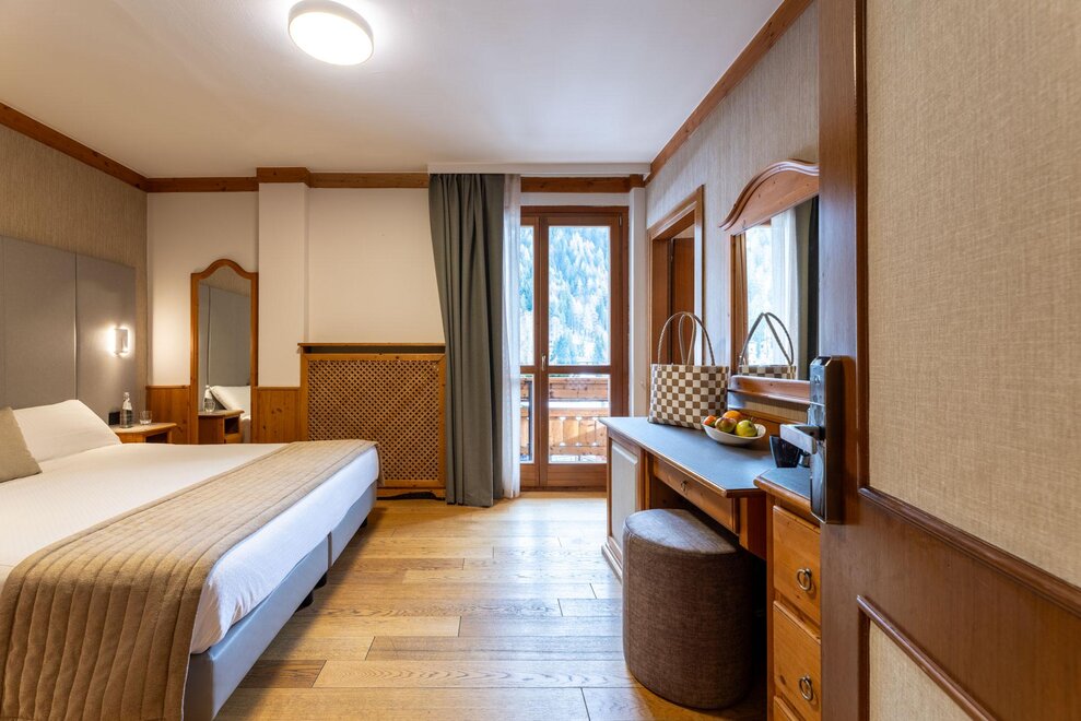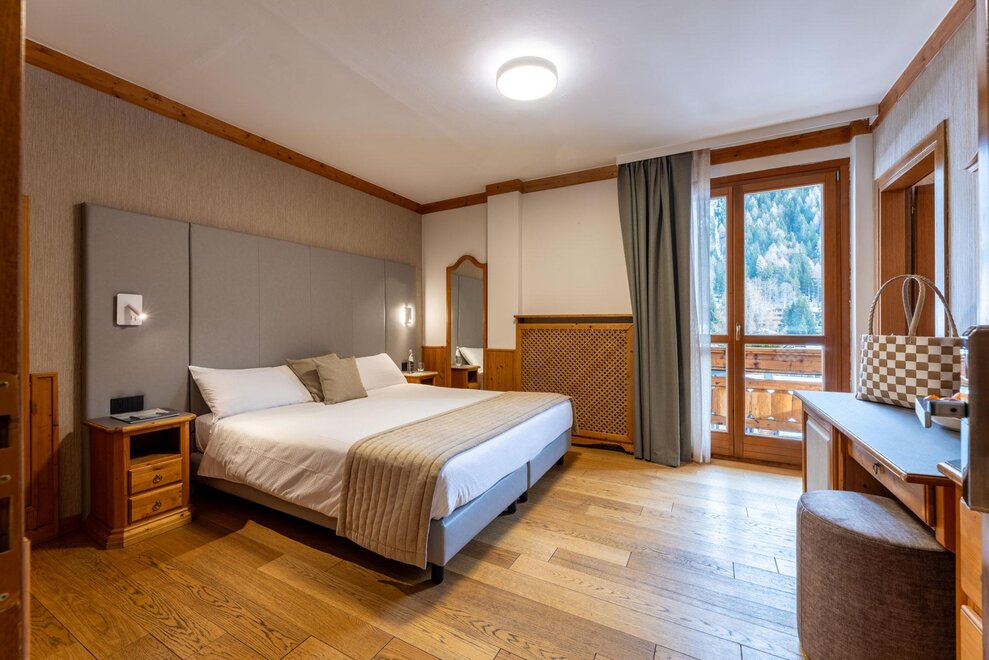 Arredo completamente nuovo, elegante e ricercato. I materiali naturali come il legno e la pelle regalano un senso di benessere e relax. Bagno moderno e spazioso, in pietra di Travertino con ampia doccia. La stanza può essere doppia o matrimoniale con caratteristico balcone con vista sul centro di Madonna di Campiglio o sulle Dolomiti.