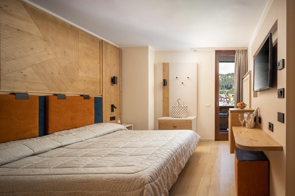Una raffinata vacanza nella nuova camera Deluxe distinta per l'eleganza del legno naturale degli arredi e del pavimento in parquet. Il bagno moderno e spazioso come anche gli ampi spazi della camera che comprende un comodo vano cabina armadio, assicurano il relax post piste da sci. Il caratteristico balcone privato invita a godere di una piacevole vista sulle Dolomiti ed il Doss del Sabbion.