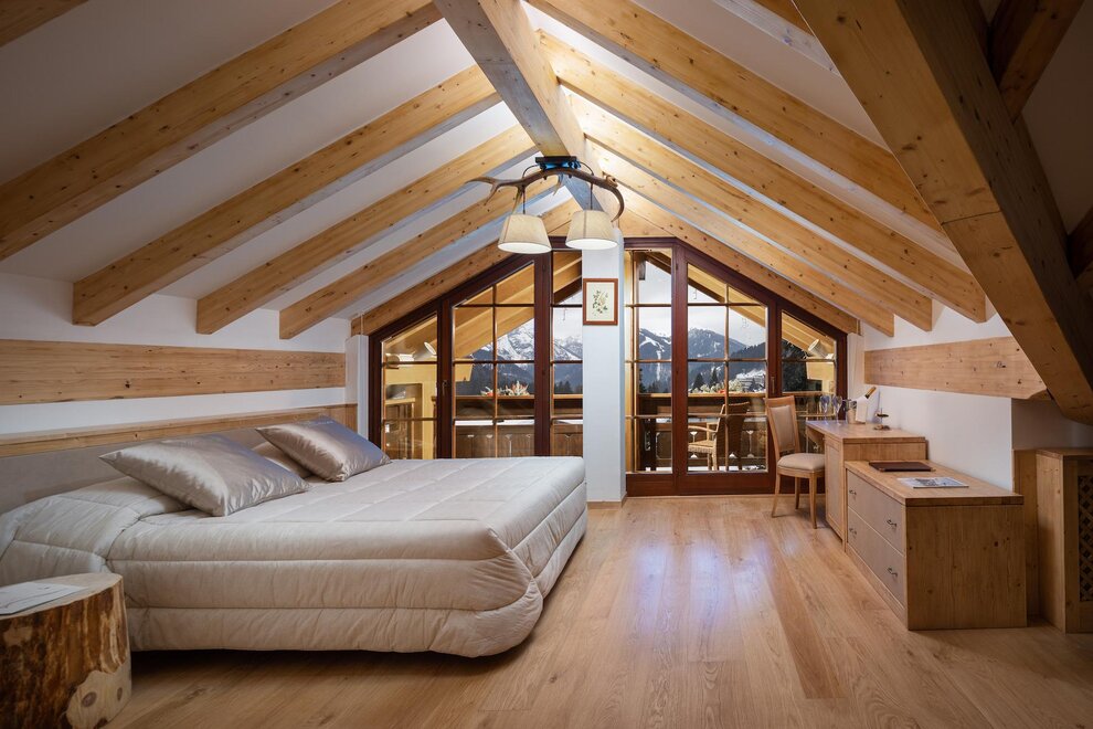 Una raffinata vacanza nella nuova camera Deluxe mansardata distinta per l'eleganza del legno naturale degli arredi e del pavimento in parquet. Il bagno moderno e spazioso come anche gli ampi spazi della camera che comprende un comodo vano cabina armadio, assicurano il relax post piste da sci. Il caratteristico balcone privato invita a godere di una piacevole vista sul centro di Madonna di Campiglio.
