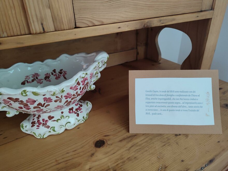 Le tende del B&B sono realizzate con dei lenzuoli di lino dono di famiglia e confezionate da Chiara ed Elisa, amiche impareggiabili, che con noi hanno creduto e supportato tenacemente questo sogno: ad impreziosirle sono i loro pizzi ad uncinetto, uno diverso dall’altro, tante storie che si intrecciano.