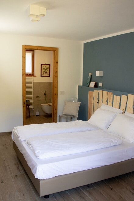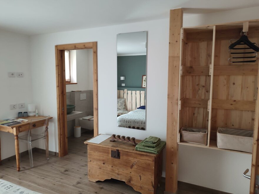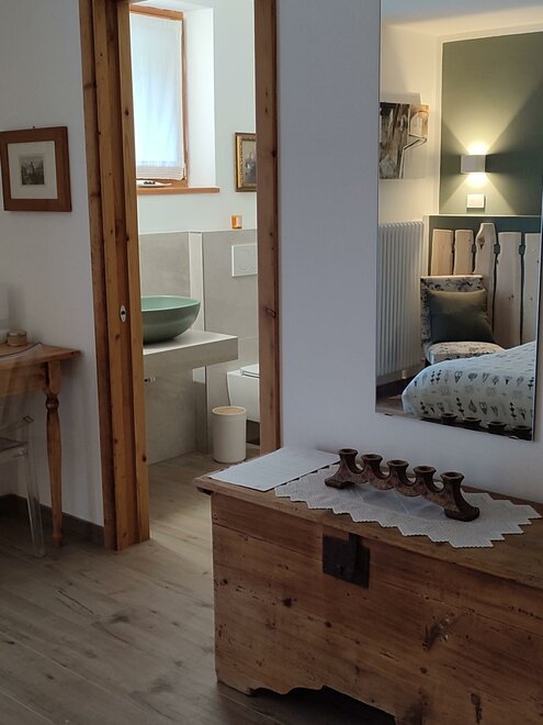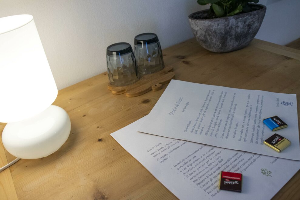 Da oggi con gioia “Storie di bosco” è anche un B&B.Disponiamo di due stanze "Pino mugo" e "Cirmolo", entrambe matrimoniali, dotate di bagno privato.La testiera del letto delle camere è stata realizzata da noi con legno di cirmolo: l’aspetto assomiglia un po’ ad una staccionata e il suo caratteristico profumo dona tranquillità al riposo. I mobili che arredano il B&B sono arrivati qui in molti modi: dono di amici, parenti o di persone che non ci sono più, sono oggetti che apprezziamo perché recuperati da posti in cui erano relegati ed in disuso e ora, riassettati e portati a nuova vita sono qui; non sono perfetti, ma sono nostri, ce ne siamo presi cura e li amiamo e apprezziamo, proprio perché sono diversi. E la diversità va oltre l’età che avanza e le piccole crepe, è accoglienza che assume la forma di una ricchezza diversa.