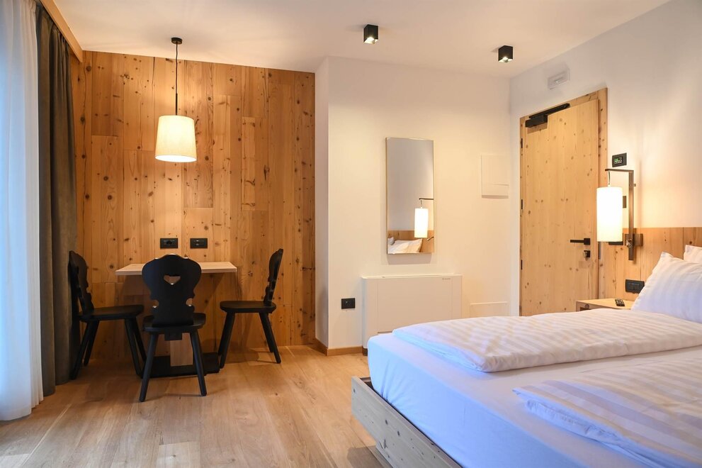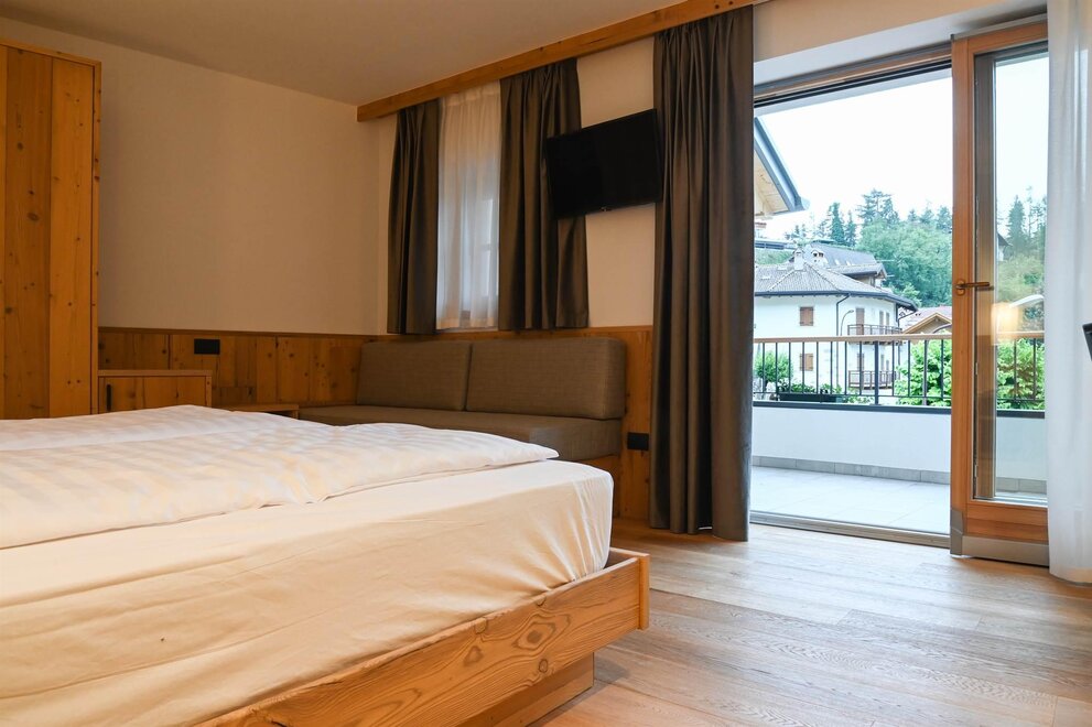 La nostra Classic Room è stata realizzata per offrire all'ospite sia una zona giorno con angolo soggiorno e divanetto sia un ampio balcone dal quale può osservare le Dolomiti di Brenta.