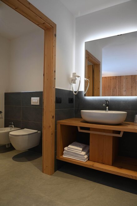 La nostra Junior Suite è stata realizzata per offrire all'ospite sia una zona giorno con angolo soggiorno e divanetto sia un ampio balcone dal quale può osservare le Dolomiti di Brenta.
