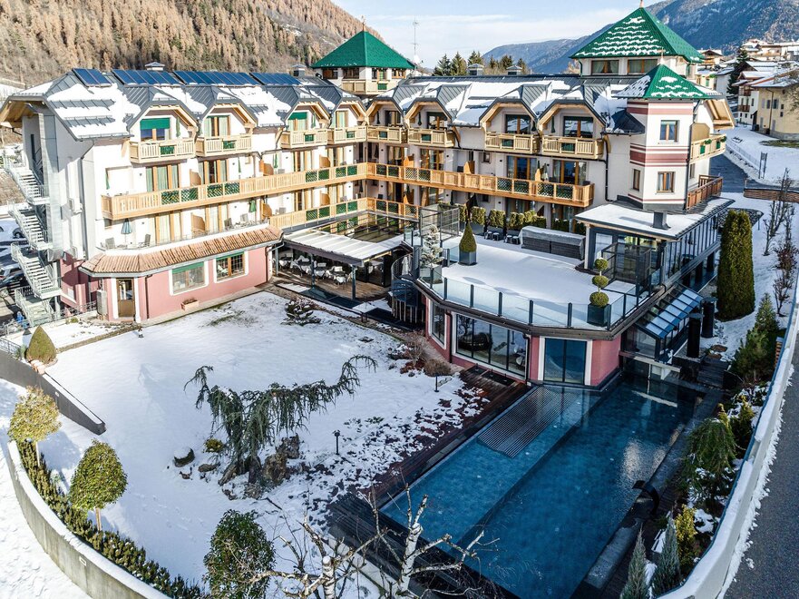 L’HOTEL TEVINI, al centro della Val di Sole a Commezzadura, a soli 500 mt dal centro paese, dalla stazione ferroviaria di Daolasa dotata di interscambio sullo stesso livello con telecabina di Daolasa in Val Mastellina che direttamente agli impianti sciistici di Folgarida Marilleva e Madonna di Campiglio e Pinzolo; fra due Parchi Naturali: “Adamello Brenta “ e “Stelvio” con tre grossi gruppi montuosi “Brenta” “Adamello Presanella” “Ortels Cevedale” e meta di partenza per appassionati ed emozionanti escursioni, accompagnate anche dalla nostra guida privata o di indimenticabili giornate sulle piste da sci. E’ dotato di ampi spazi comuni quali: hall, bar, sala TV, sala soggiorno, sala sigari & room giardino esterno, parcheggio esterno gratuito, coperto a pagamento.