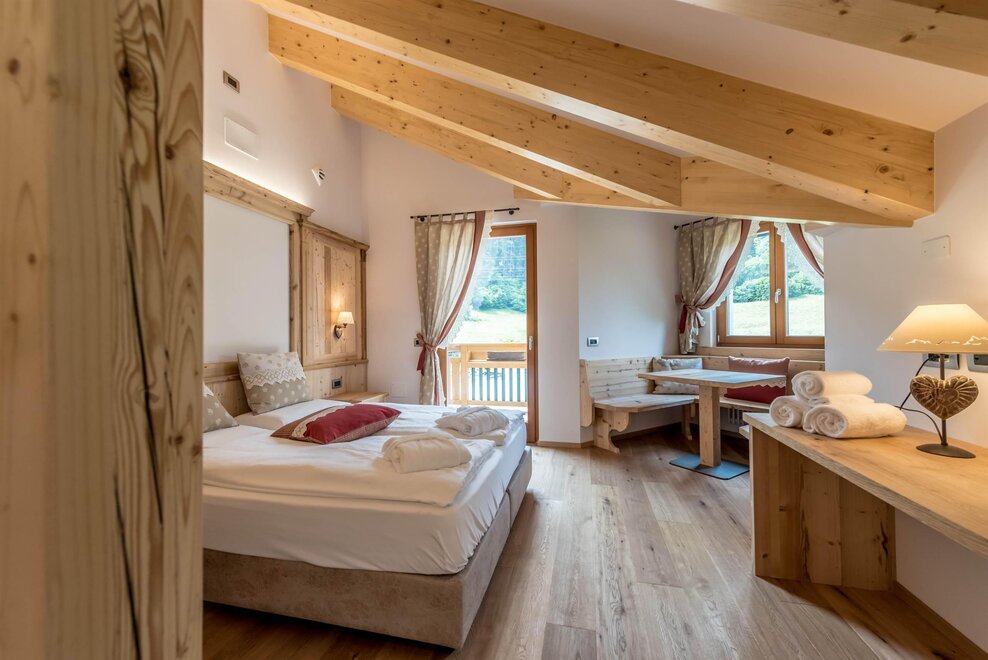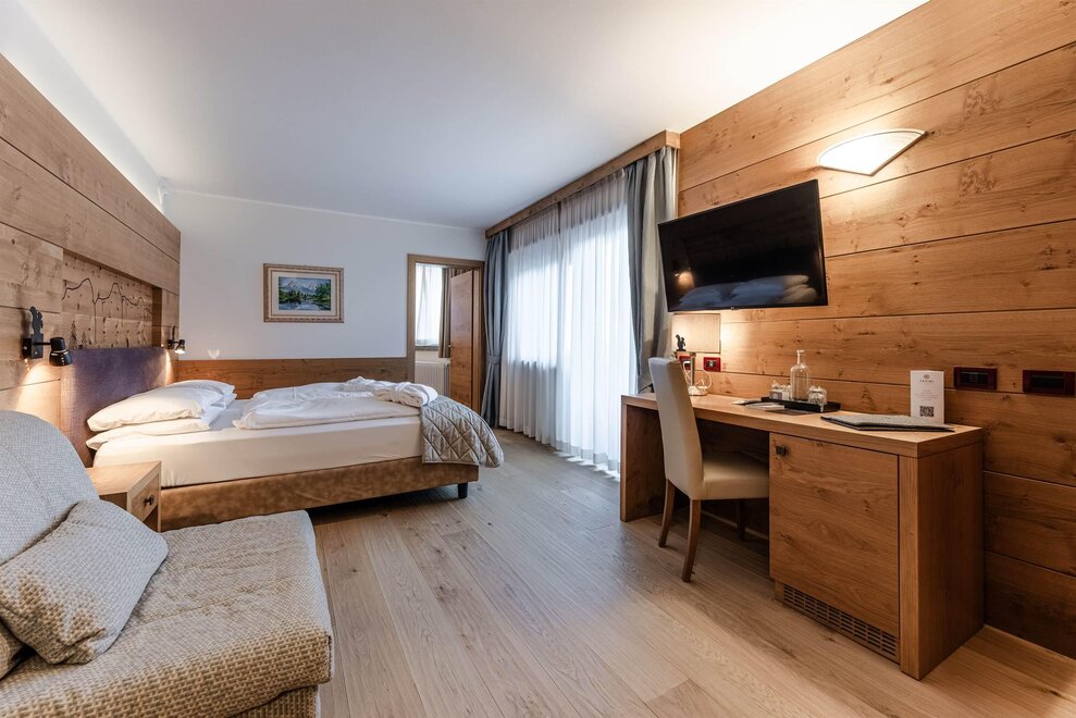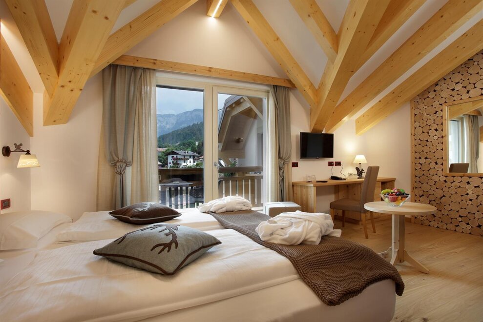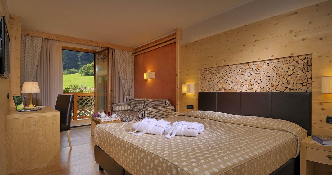 Accoglienti camere doppie con comodo letto matrimoniale, pavimento in legno, TV, Wi-Fi, frigobar, balcone con sdraio e vista sulle montagne. Bagno con doccia, asciugacapelli e set di prodotti di cortesia. Wellness bag in camera.
