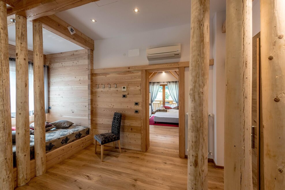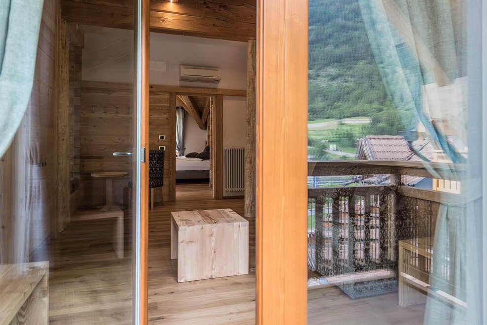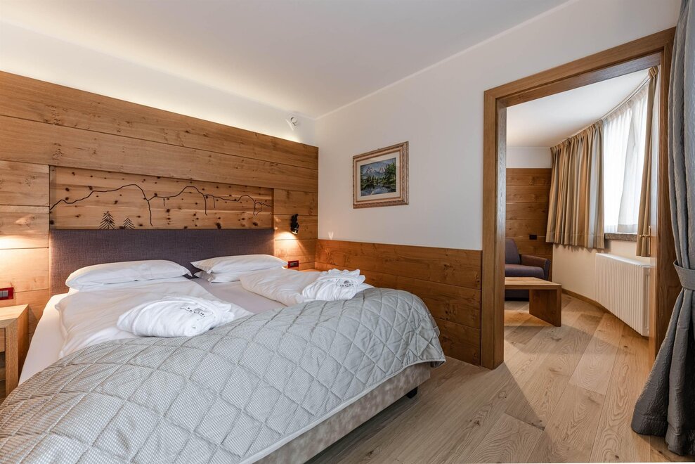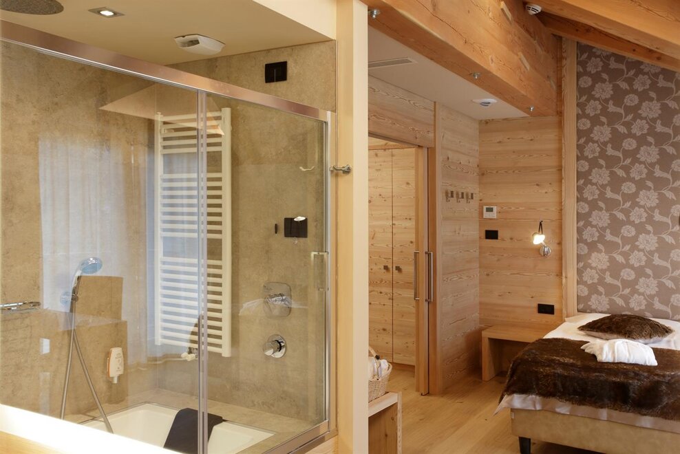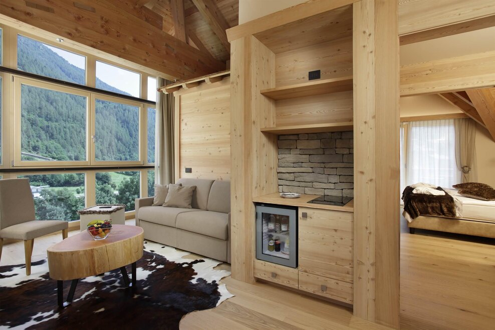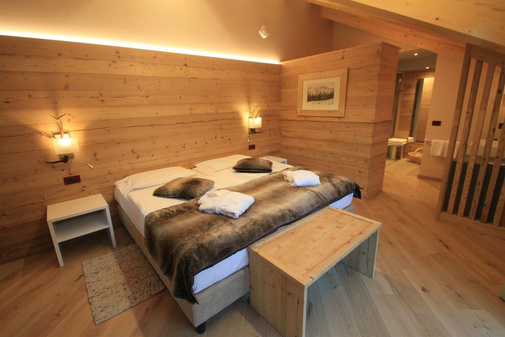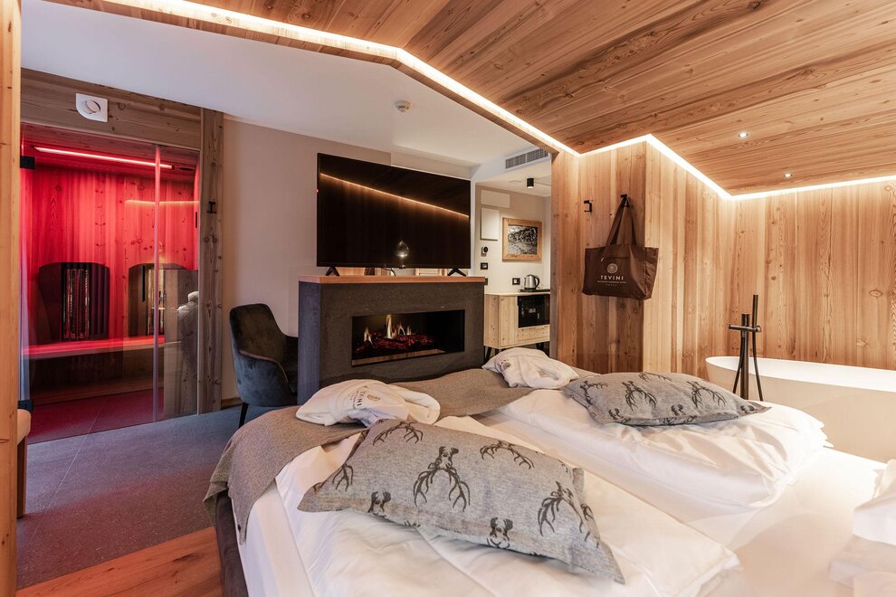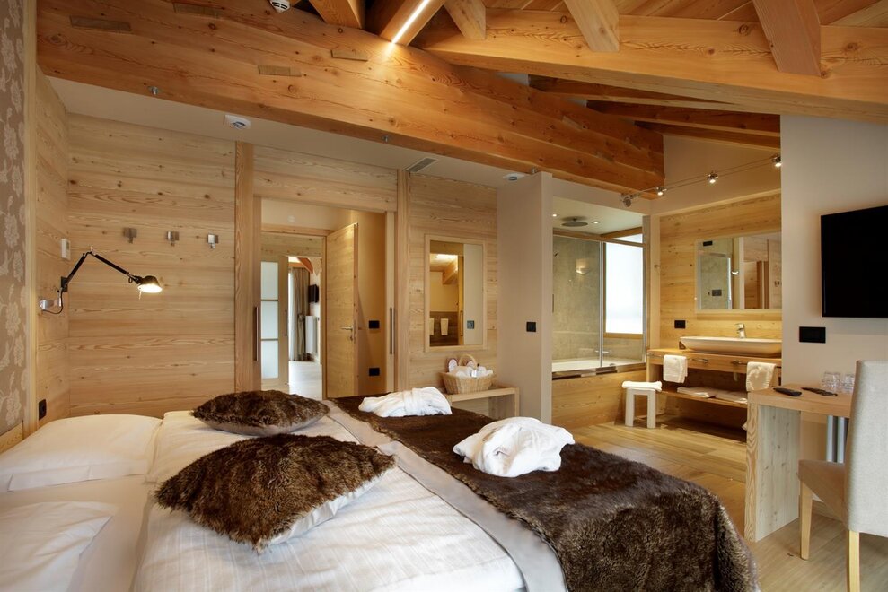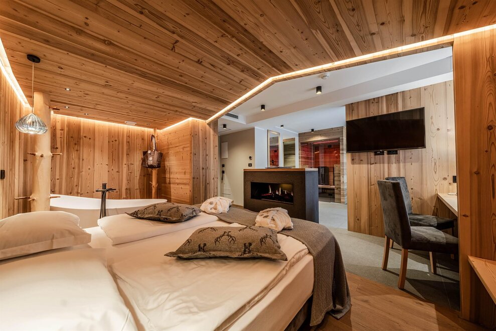 Camera arredata nel caratteristico stile di montagna, con toni naturali e profumo di larice, in grado di trasmettere una piacevole sensazione di freschezza e tranquillità. Dotata di due balconi, vetrata panoramica, pavimento in legno, TV LCD, telefono con sveglia, cassaforte, Wi-Fi, frigobar, aria condizionata e sistema di ventilazione meccanica controllata. Troverete un piccolo angolo cottura con the e caffè e un salottino con divano e caminetto. Due bagni con doccia, servizi privati di cui uno con vasca. Wellness bag in camera.
