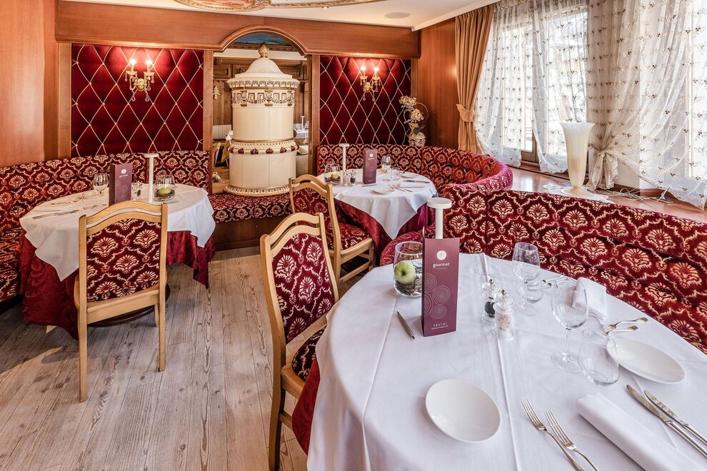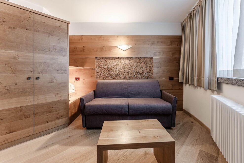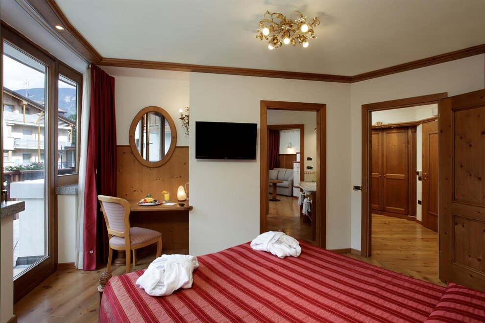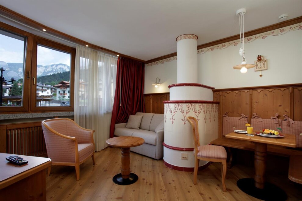 cassaforte, telefono con sveglia, Tv color con programmi satellite, wi-fi e balcone.JUNIOR SUITE ORTLES o BRENTA stanze con comodo salotto panoramico, dotate di stufa in ceramica, ampi servizi da bagno con doccia idromassaggio e vasca, phon, accappatoio e ciabattine, cassaforte, telefono con sveglia, wi-fi, Tv color con programmi satellite, minibar e terrazza con tavolo e sedie.