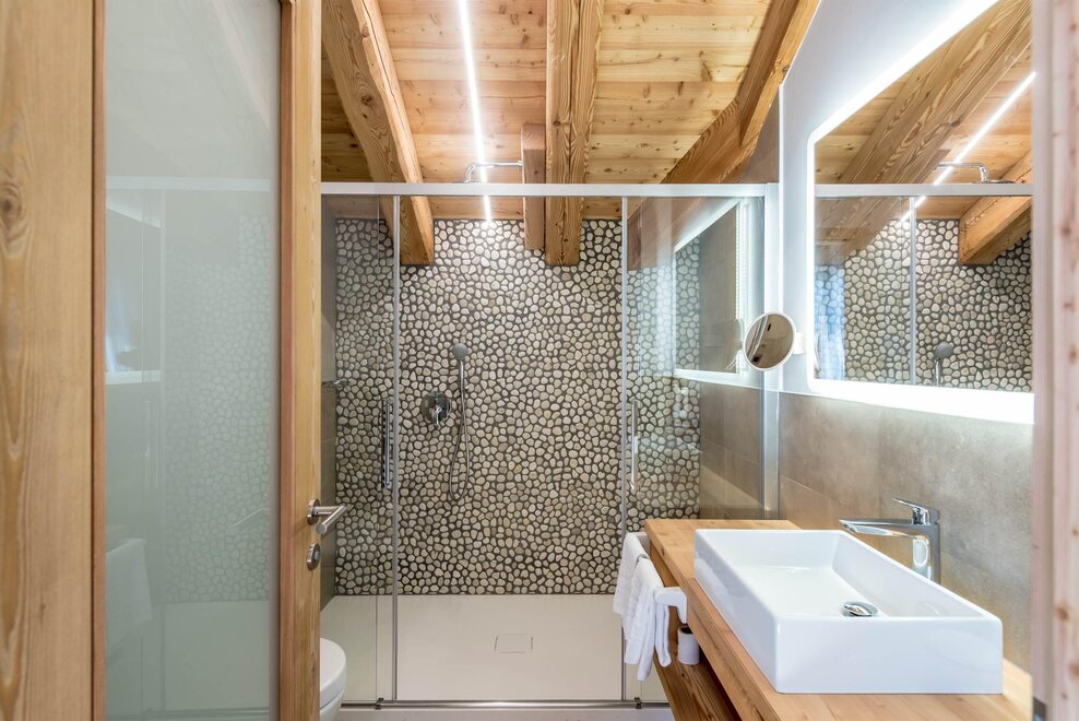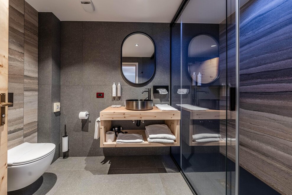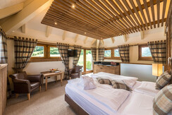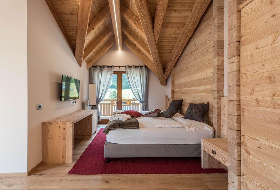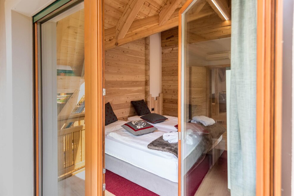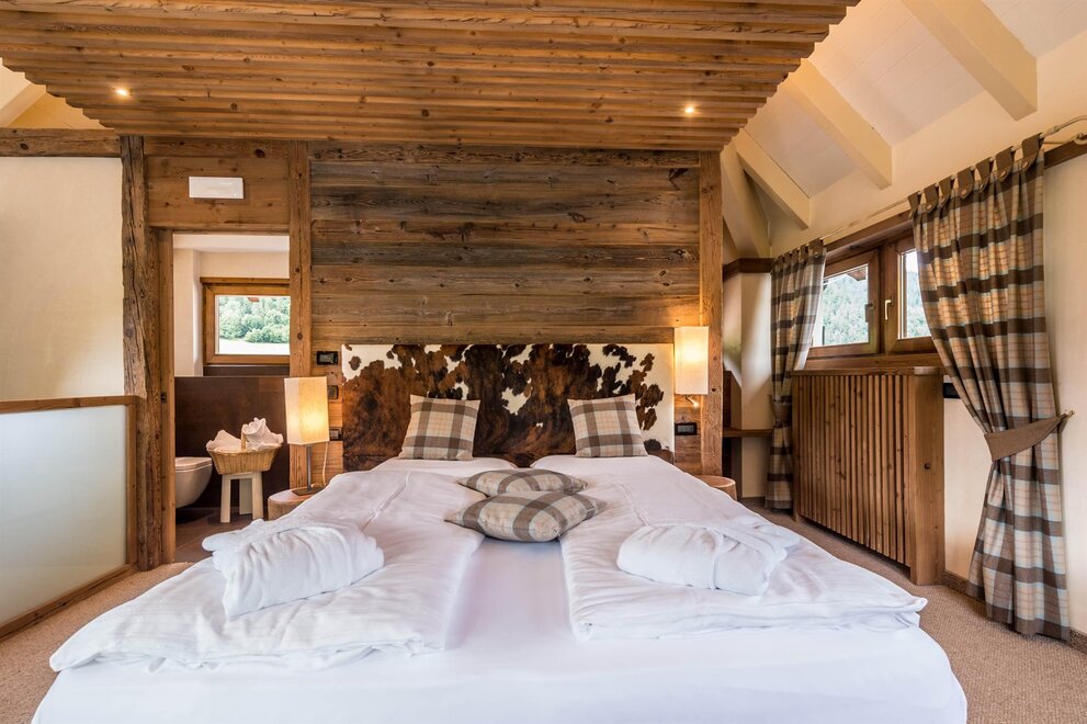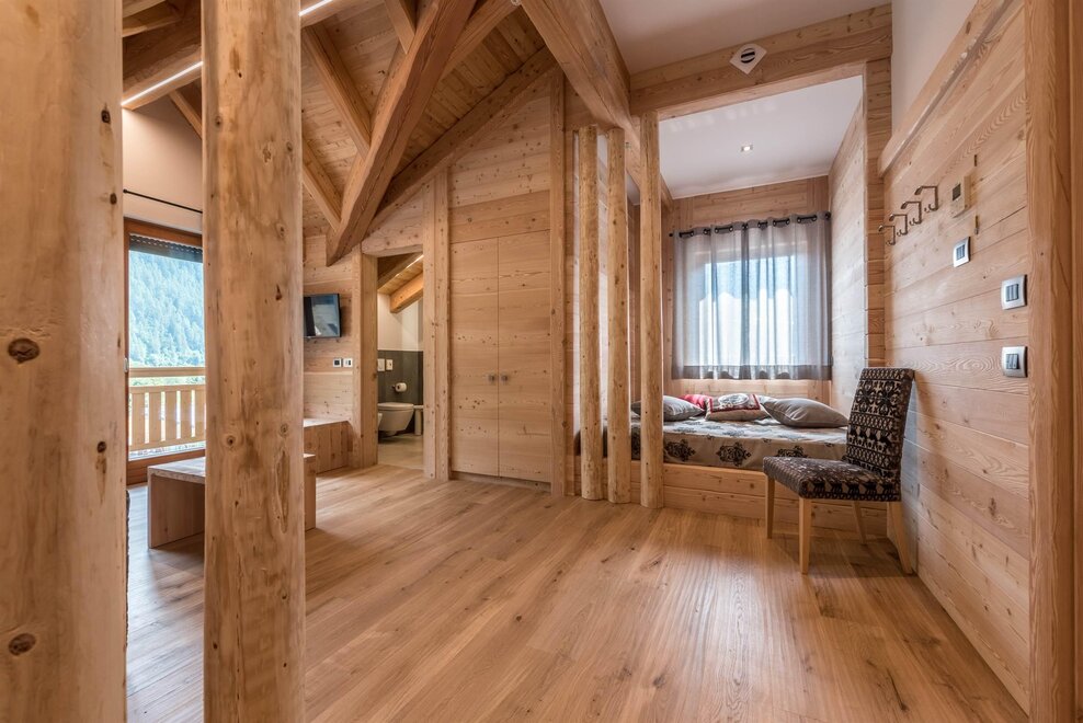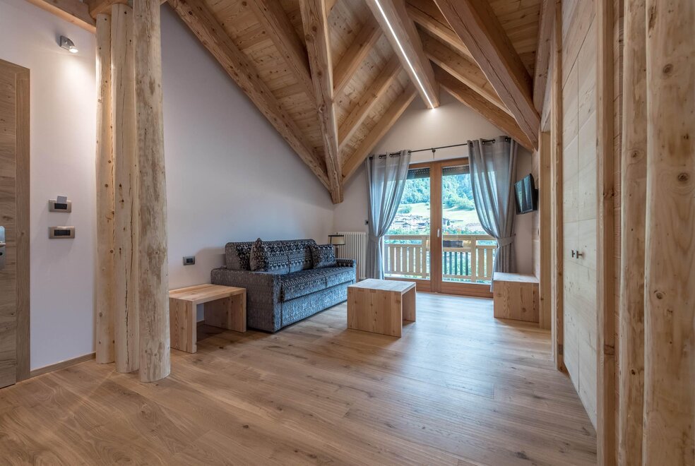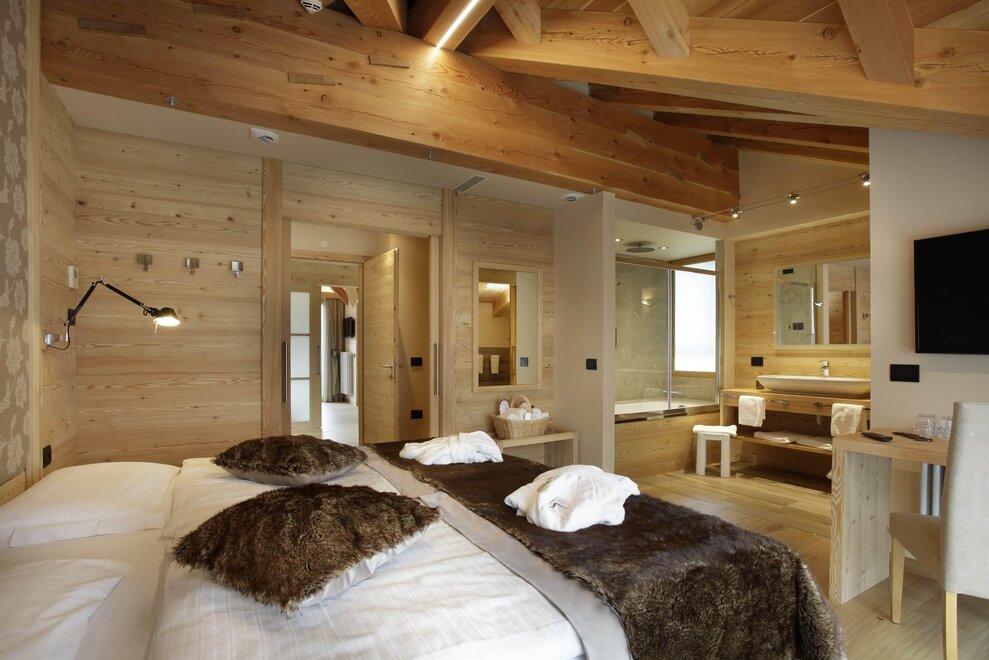 Chalet di montagna con pavimento in legno di rovere, per la maggior parte mansardati e situati al terzo piano. Dispongono di comodo letto matrimoniale, salottino con divano, TV con canali Sky, Wi-Fi, aria condizionata e impianto di ventilazione controllata, frigobar e balcone con sdraio e vista sulle montagne. Ampio bagno con doccia, asciugacapelli e set di prodotti di cortesia. Borsa wellness con accappatoio, telo piscina e ciabatti