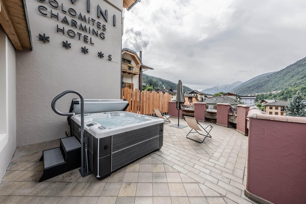 Junior suite accogliente ed elegante per 2-4 persone. Dispone di comodo letto matrimoniale, salottino con divano e poltroncina, pavimento in legno di rovere, LCD-TV, Wi-Fi, frigobar, aria condizionata, ampia terrazza con sdraio, vasca idromassaggio Jacuzzi e vista sulle montagne. Spazioso bagno con doccia, asciugacapelli e set di prodotti di cortesia. Wellness bag in camera. Dotata di sistema di ventilazione controllata.