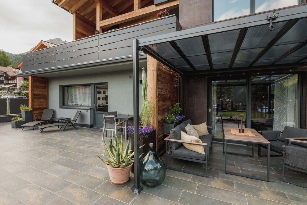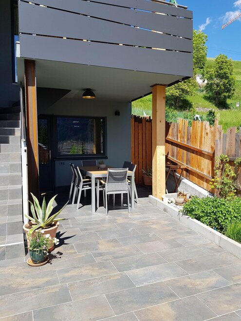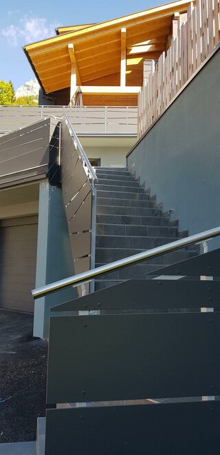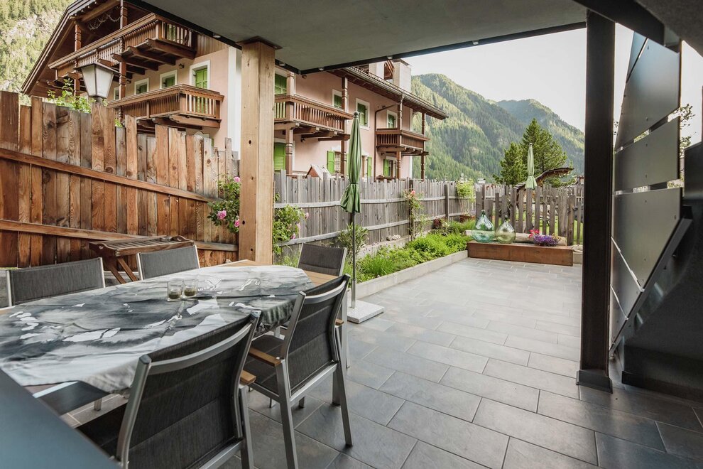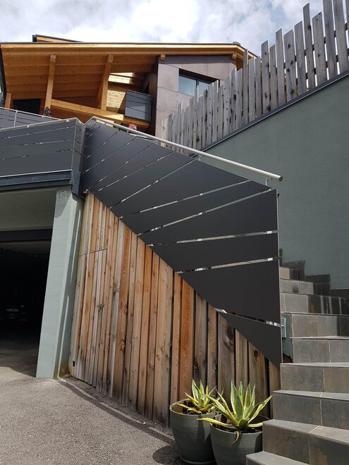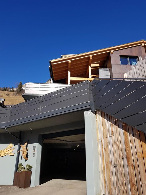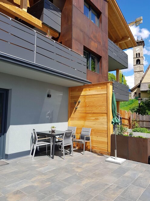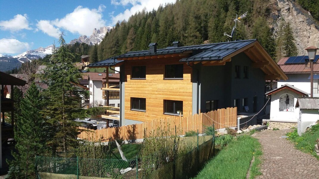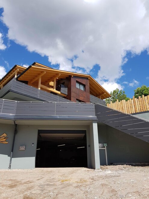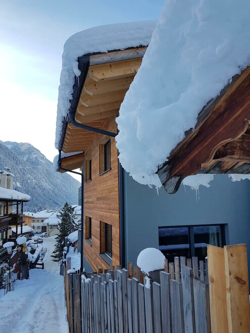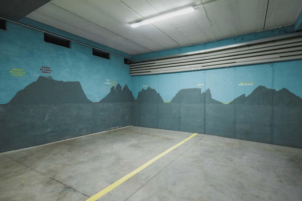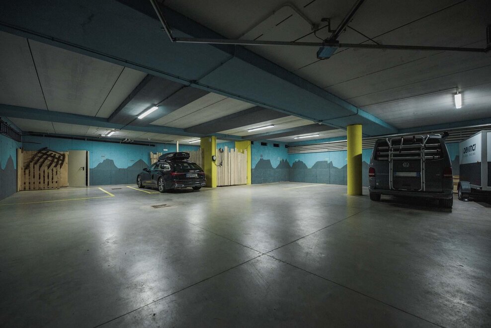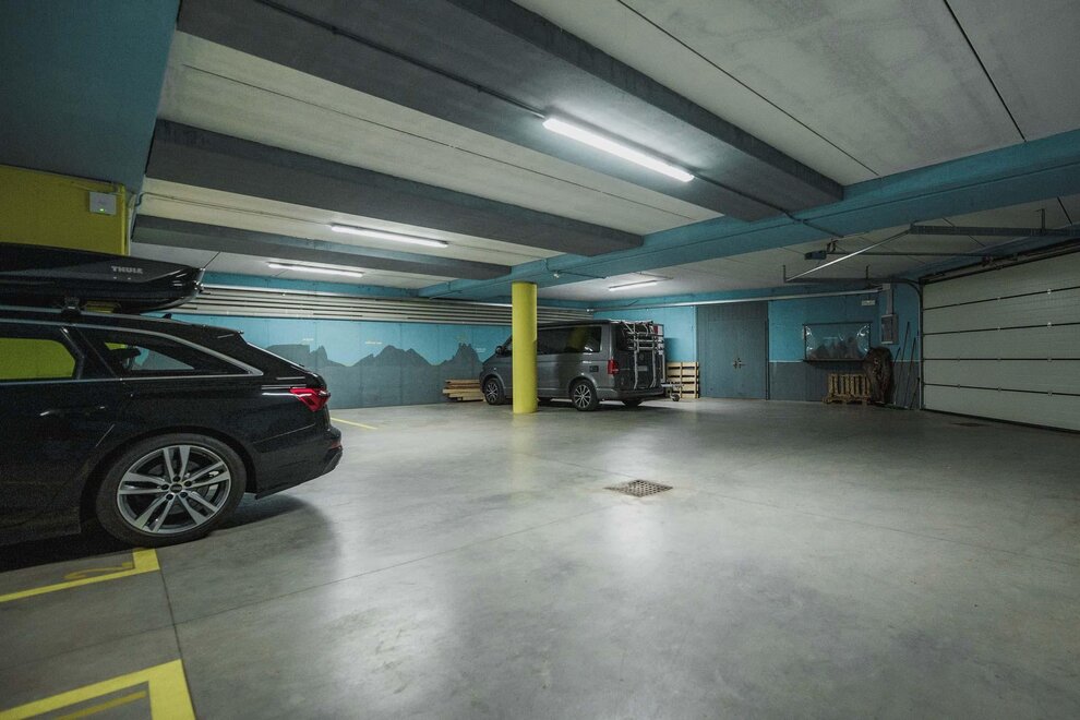 Dalla strada tranquilla si accede direttamente al garage, skiroom e deposito per bici e attrezzatura. Una scala porta al piano successivo, dove si trova la casa e il giardino.