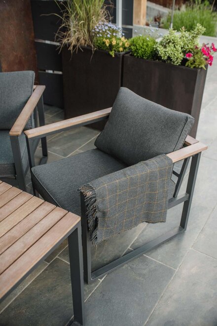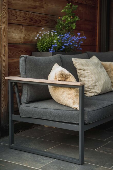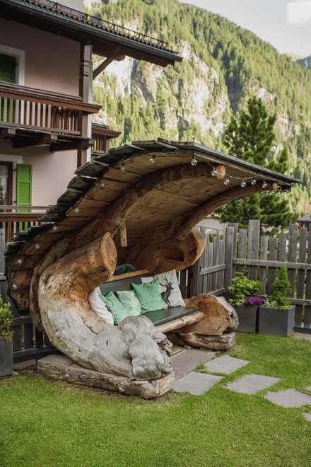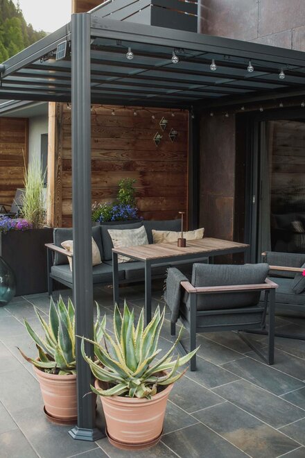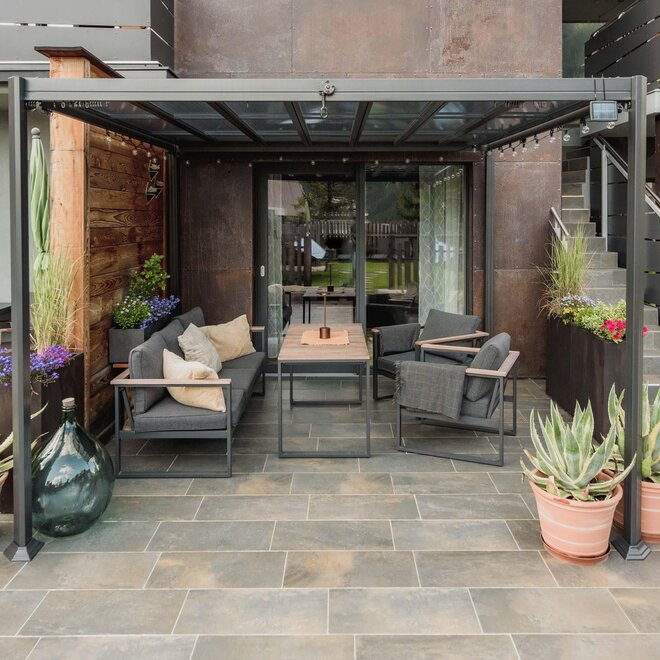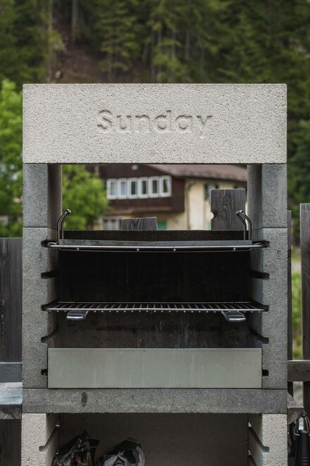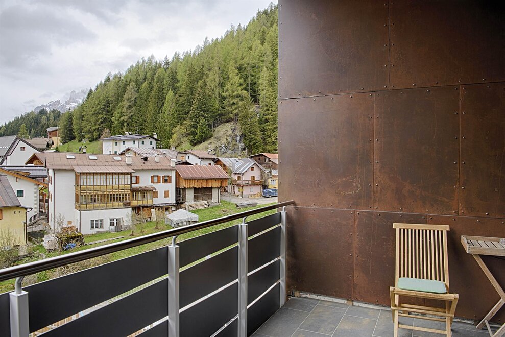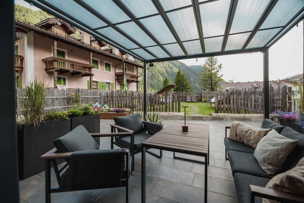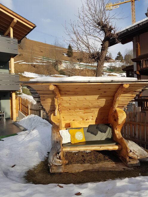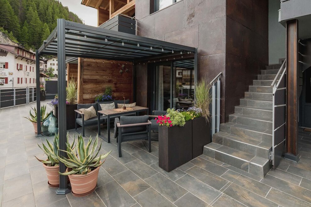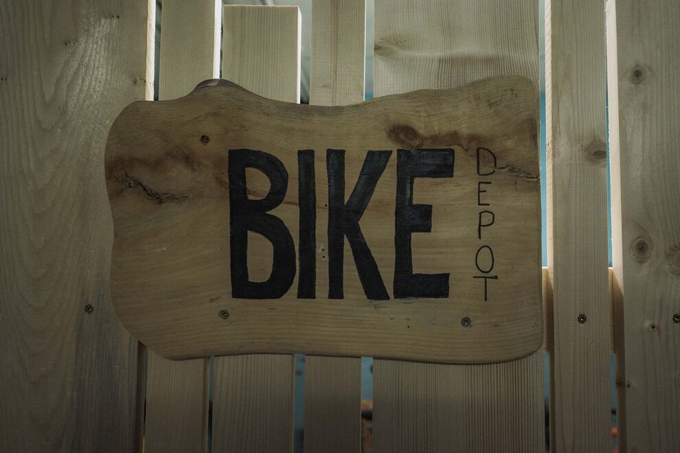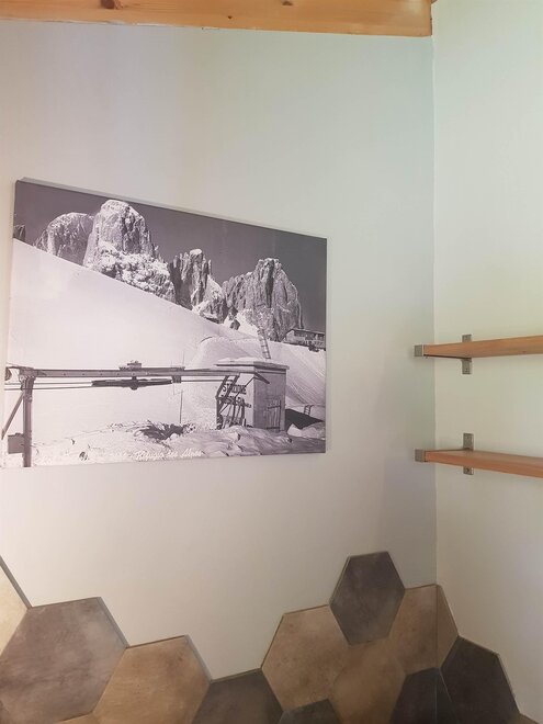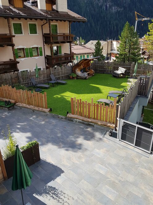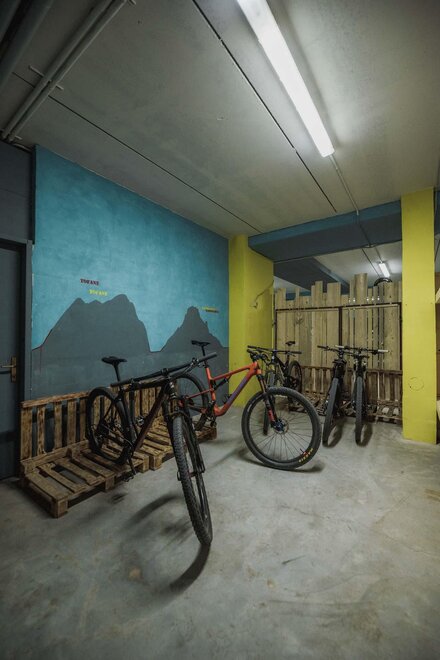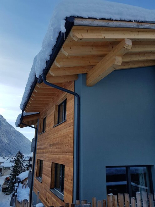 Dalla strada tranquilla si accede direttamente al garage, skiroom e deposito per bici e attrezzatura. Una scala porta al piano successivo, dove si trova la casa e il giardino.