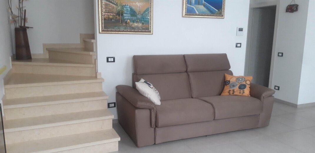 VILLA ALTA è un'intera casa disposta su tre piani. Al piano terra si trova un piccolo garage facilmente accessibile. Al primo piano un ampio open space con cucina completa e soggiorno più un bagno. Al secondo piano una grande stanza con letto matrimoniale ed una con due letti singoli, più un bagno finestrato con doccia e bidet.