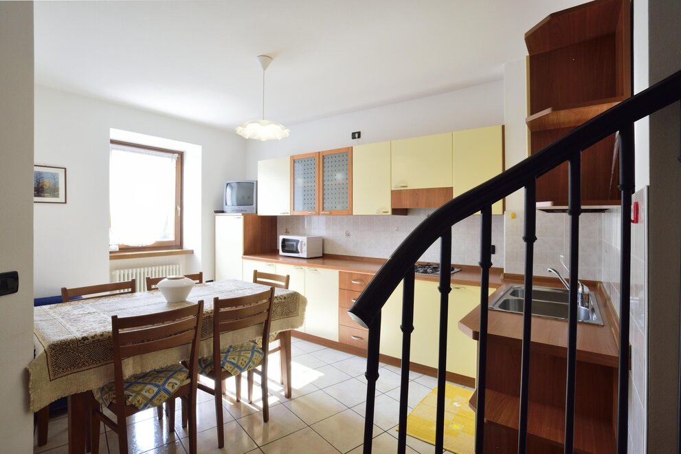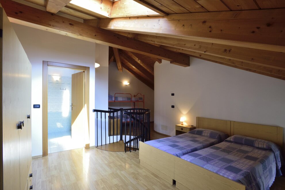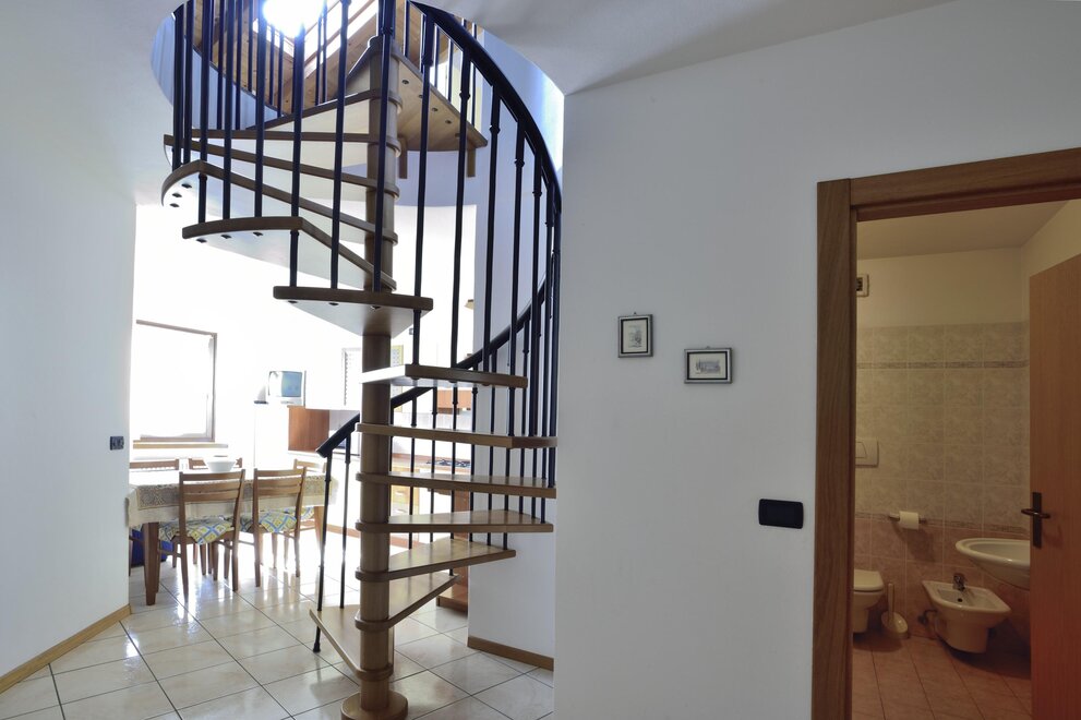 Appartamento per vacanze al secondo piano di 70 mq disposto su due livelli, formato da cucina,bagno con doccia,camera da letto matrimoniale con balcone; Scala interna in legno che sale al piano sopra dove si trova stanza con due letti singoli e un letto a castello, bagno con doccia.