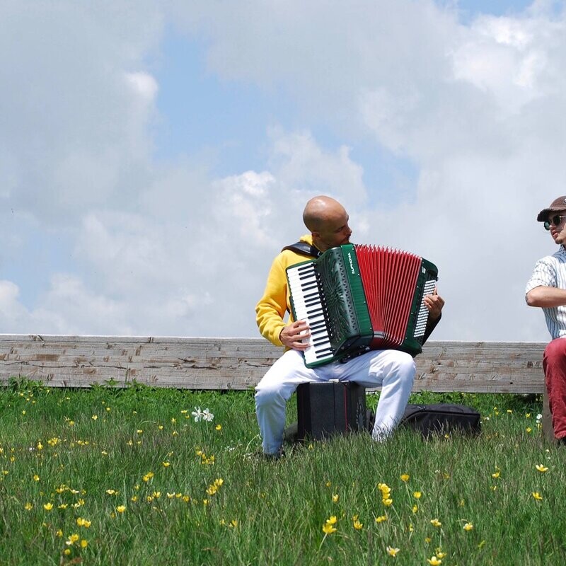 Il mitico Barbadicapra vi stupisce suonando una fisarmonica… con un bastone in testa o da un altissimo monociclo.