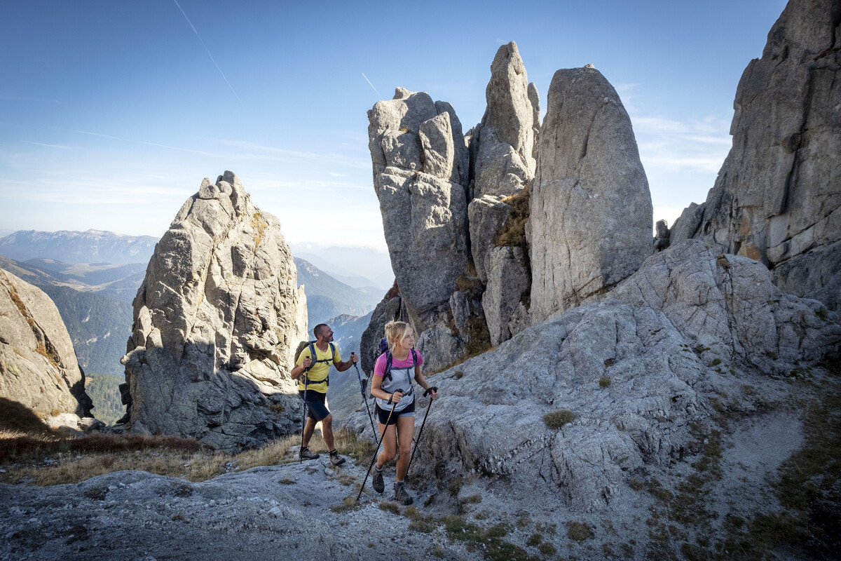 La sesta tratta del Sentiero della Pace, composta da 7 tappe e lunga oltre 120 km, è un continuo saliscendi che, dai laghi Bandiera Blu della Valsugana conduce fino alle dolomitiche Pale di San Martino. Tra i due estremi, il selvaggio Lagorai, con le sue rocce porfiriche e l’insolita isola di granito di Cima d’Asta, i verdi pascoli e i piccoli laghi glaciali avvolti dal silenzio.