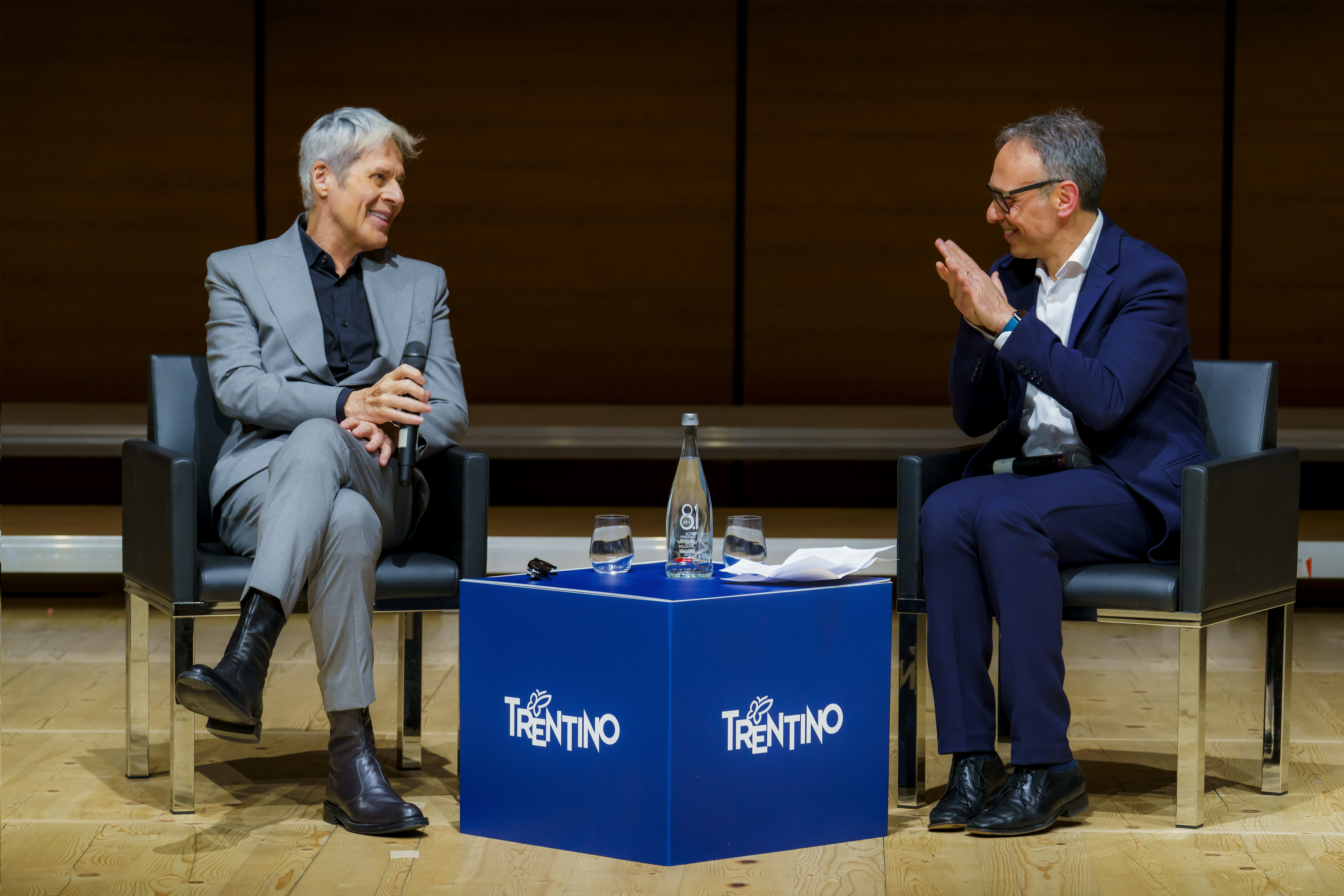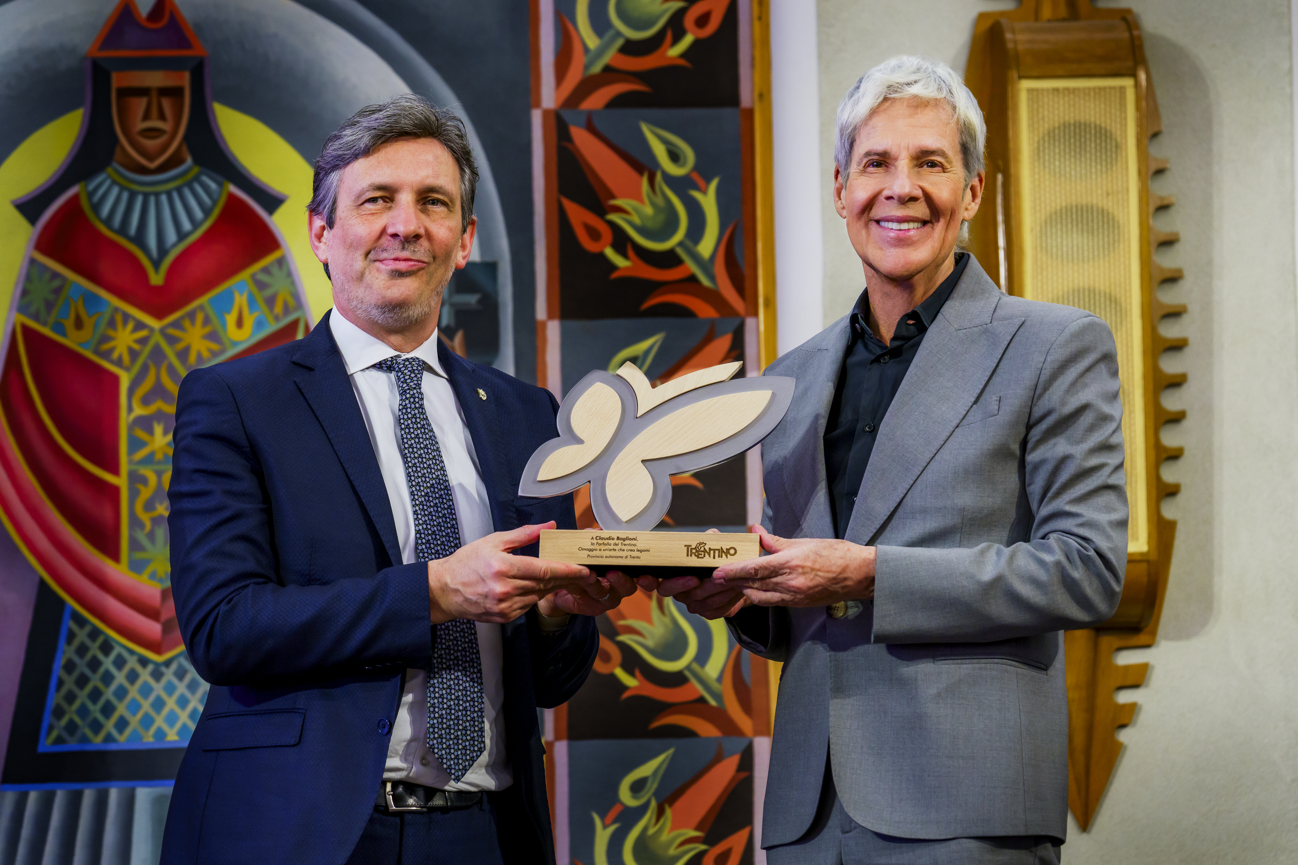 A consegnare il riconoscimento a nome del presidente e di tutta la Giunta provinciale è stato il vicepresidente Spinelli: «È per noi una grande emozione accogliere qui a Trento un Artista tra i più amati del panorama musicale italiano, durante un momento davvero speciale della tua carriera. Il riconoscimento che consegniamo oggi, La Farfalla del Trentino, è il simbolo con cui questa terra si presenta al mondo. Racconta non solo una conformazione geografica, ma soprattutto appartenenza: legami tra persone, luoghi e generazioni. Legami come quelli che crea l’arte e la musica di Claudio Baglioni». E rivolgendosi direttamente all’Artista: «Siamo onorati di essere una tappa del suo Grand Tour e lo ringraziamo per aver scelto Trento e il Trentino, sottolineando così la forza artistica e il legame con il nostro territorio e la sua bellezza».