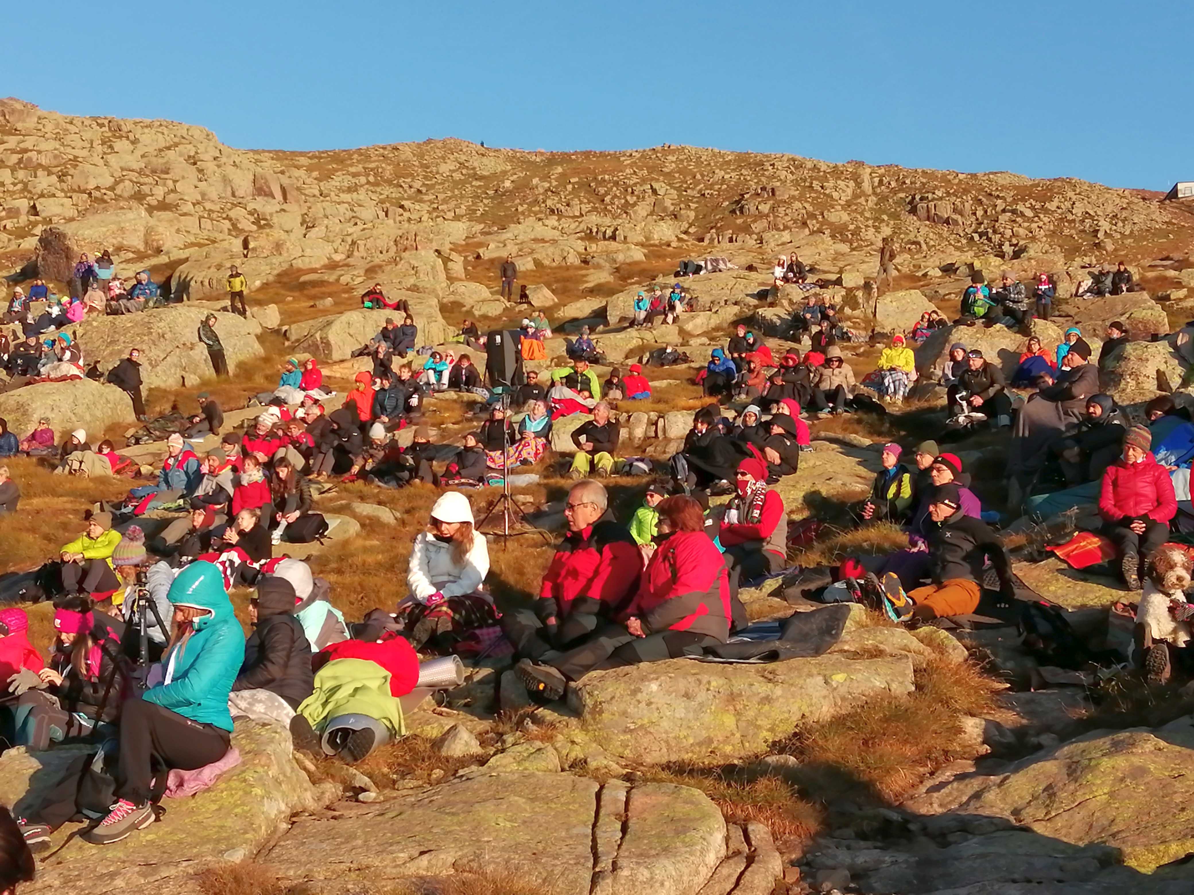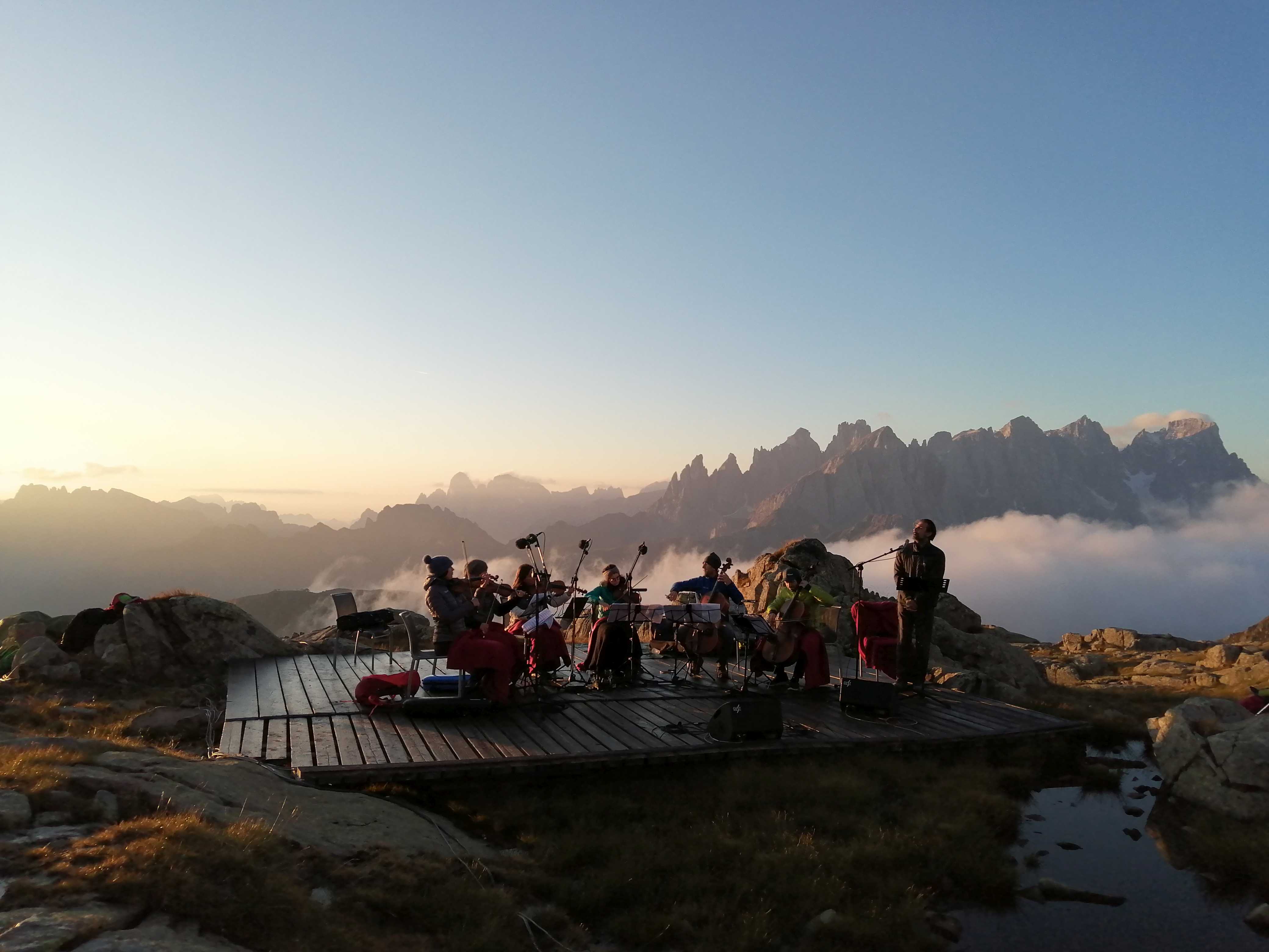 È stata un’alchimia perfetta quella che questa mattina, ai 2500 m del Col Margherita sopra Passo San Pellegrino, si è creata grazie all’Arte, ovvero la musica e il racconto, e la Natura, e di cui sono stati testimoni nel silenzio più assoluto, quasi rapiti, gli oltre 500 spettatori, che sono saliti a notte fonda fin lassù per assistere all’Alba delle Dolomiti.