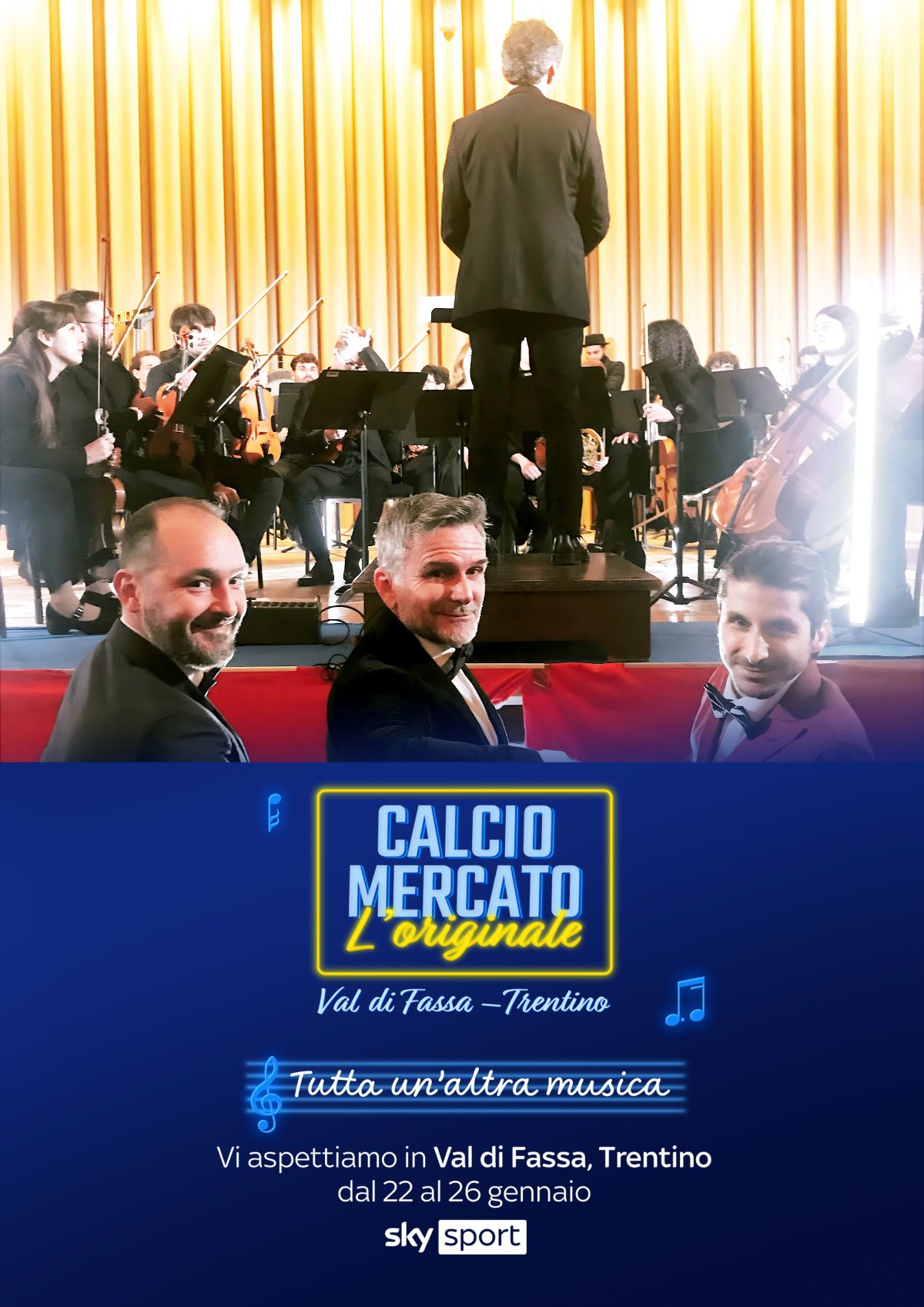 S’illumina di tutte le sfumature delle nevi della Val di Fassa “Calciomercato l’Originale”, il seguitissimo programma che, dal 22 al 26 gennaio dalla valle ladina, trasmette in diretta (dalle 23 alle 24) su Sky Sport 24, Sky Sport Calcio e in streaming su NOW. Il programma - scritto e ideato da Alessandro Bonan, Davide Bucco e Guido Barucco, con la regia creativa di Roberto “Popi” Montoli - racconta attraverso il suo studio itinerante le trattative del mercato invernale. Si tratta di un format che supera la cronaca degli affari tra i club, secondo una ricetta di successo, che mescola sapientemente generi, opinioni e musica. Ma in questi giorni le puntate di “Calciomercato” diventano davvero imperdibili grazie alla presenza del gruppo di Sky Sport in Val di Fassa.