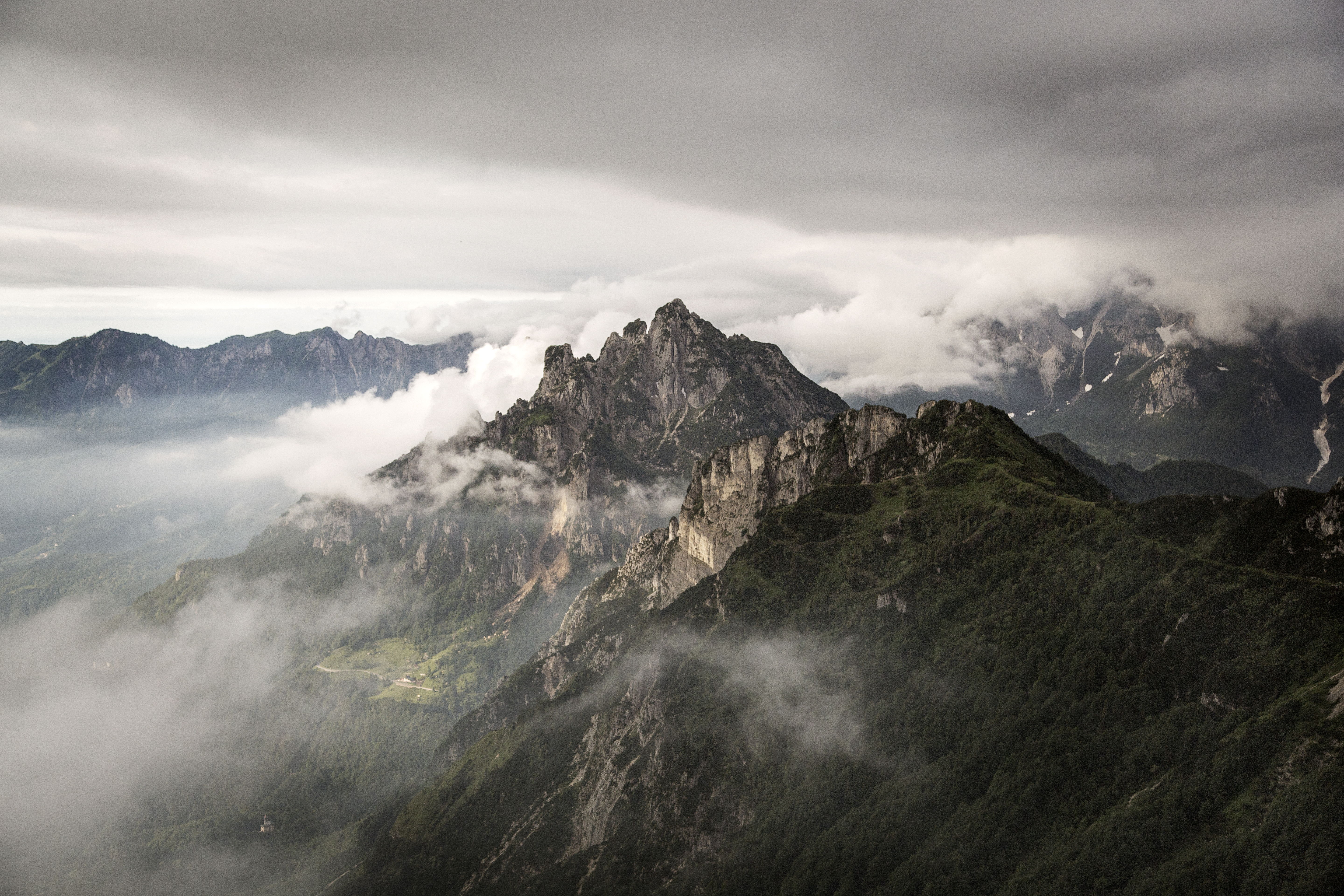 Il Gruppo del Pasubio si trova nel Trentino meridionale a pochi chilometri da Rovereto e da Schio ed è un terreno alpino unico: era ed è una montagna di frontiera – un tempo separava l’Impero austro-ungarico e il Regno d’Italia mentre oggi è divisa tra le province di Trento e Vicenza. Ma è lo stesso massiccio ad essere praticamente diviso in due: a nord grandi altipiani con prati e alpeggi, a sud un paesaggio lunare ancora profondamente segnato dalle opere della Prima guerra mondiale e pareti verticali che salgono immerse nella tipica vegetazione delle prealpi.