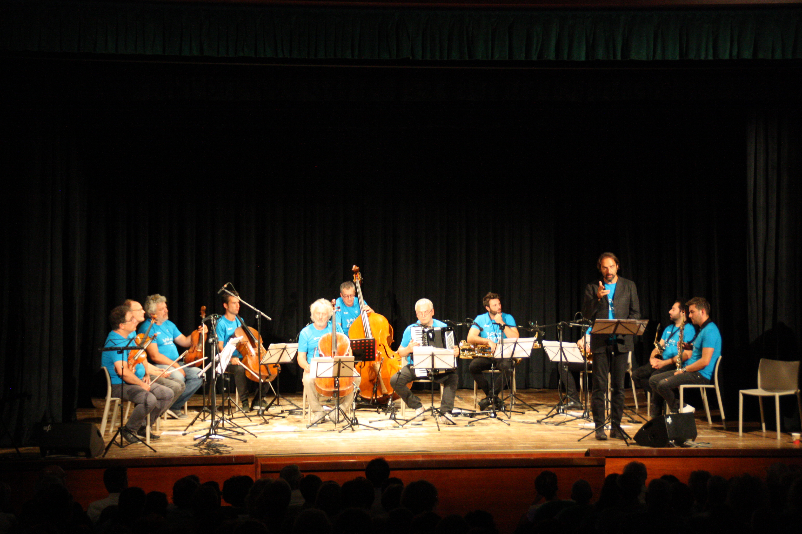 Questi piccoli sassi non erano soli, hanno vissuto in un fiume di musica eseguita da Marco Rizzi, Regis Bringolf, Danilo Rossi, Mario Brunello, Florian Berner, Gabriele Raggianti, Ivano Battiston, SIGNUM Saxophone Quartet. Un palcoscenico color azzurro per le tante magliette deI Suoni delle Dolomiti, che un po' hanno fatto pensare alle acque che hanno segnato le guerre di ieri – Piave, Adige, Danubio, Drina – e quelle di oggi (il Mediterraneo) con i musicisti simbolicamente divisi in due: da un lato gli archi e dall'altro i fiati mentre al centro, in una sorta di terra di nessuno, liberi battitori e tra questi Mario Brunello col suo violoncello e Ivano Battiston con la sua fisarmonica.
