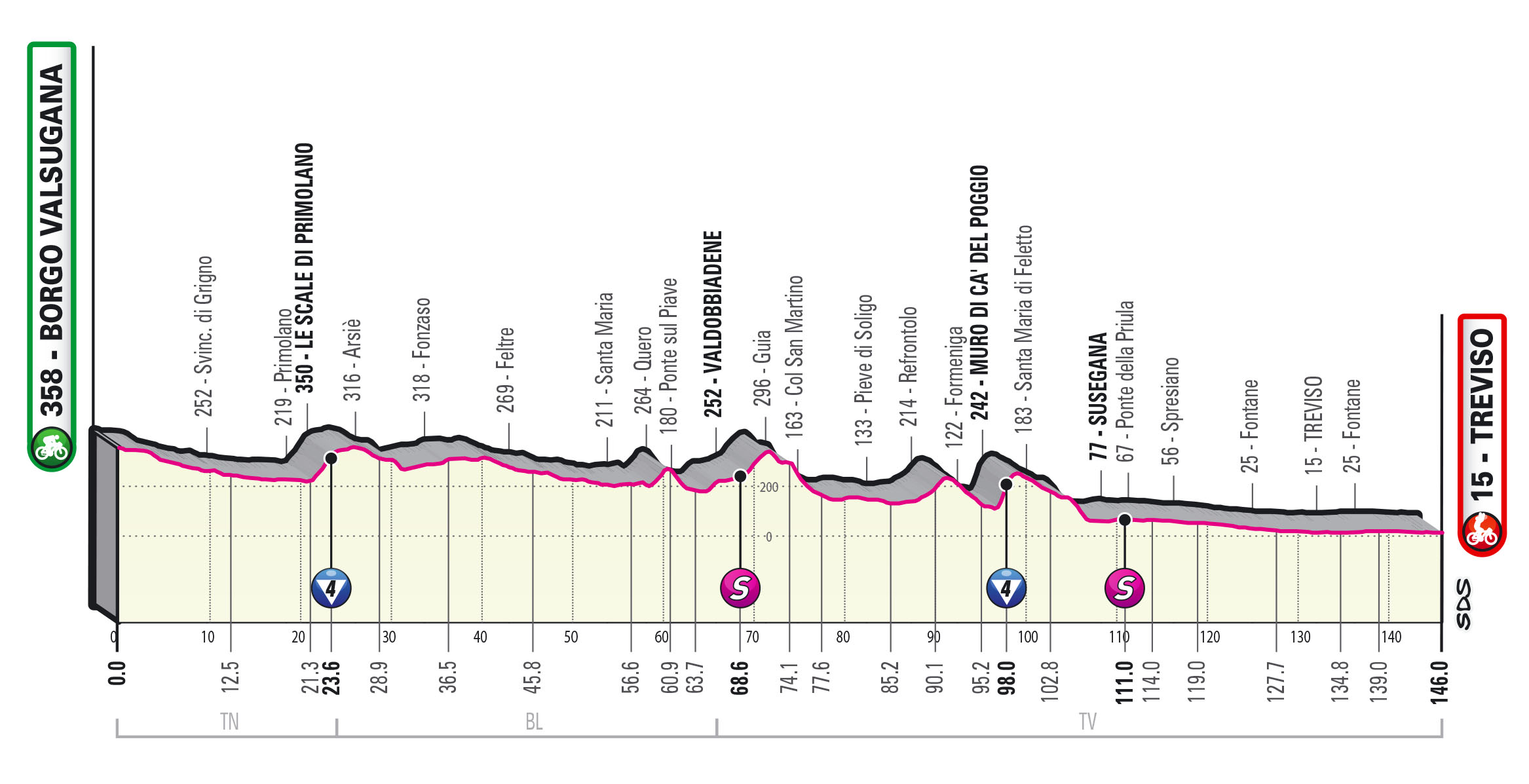 La tappa partirà da Borgo Valsugana, proseguirà verso Grigno e raggiungerà le storiche Scale di Primolano, porta d'accesso alla valle del Piave fino al traguardo di Treviso per l’ultima volata di questo Giro n.105.