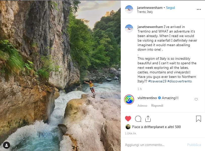 «Possiamo tranquillamente affermare”, dice Maurizio Rossini CEO di Trentino Marketing, “che in questi giorni c’è un racconto del Trentino e di tutte le sue maggiori attrattive che sta scorrendo sotto gli occhi dell’intero pianeta, grazie alle esperienze riportate da centinaia di blogger e influencer che sono riuniti a Trento per questo evento e che solo nei primi due giorni hanno già prodotto un numero davvero enorme, oltre 10 milioni di impressions e 7 milioni di reach, ovvero il numero di volte che i contenuti dedicati al nostro territorio sono stati visualizzati da fan e follower sui principali canali social».