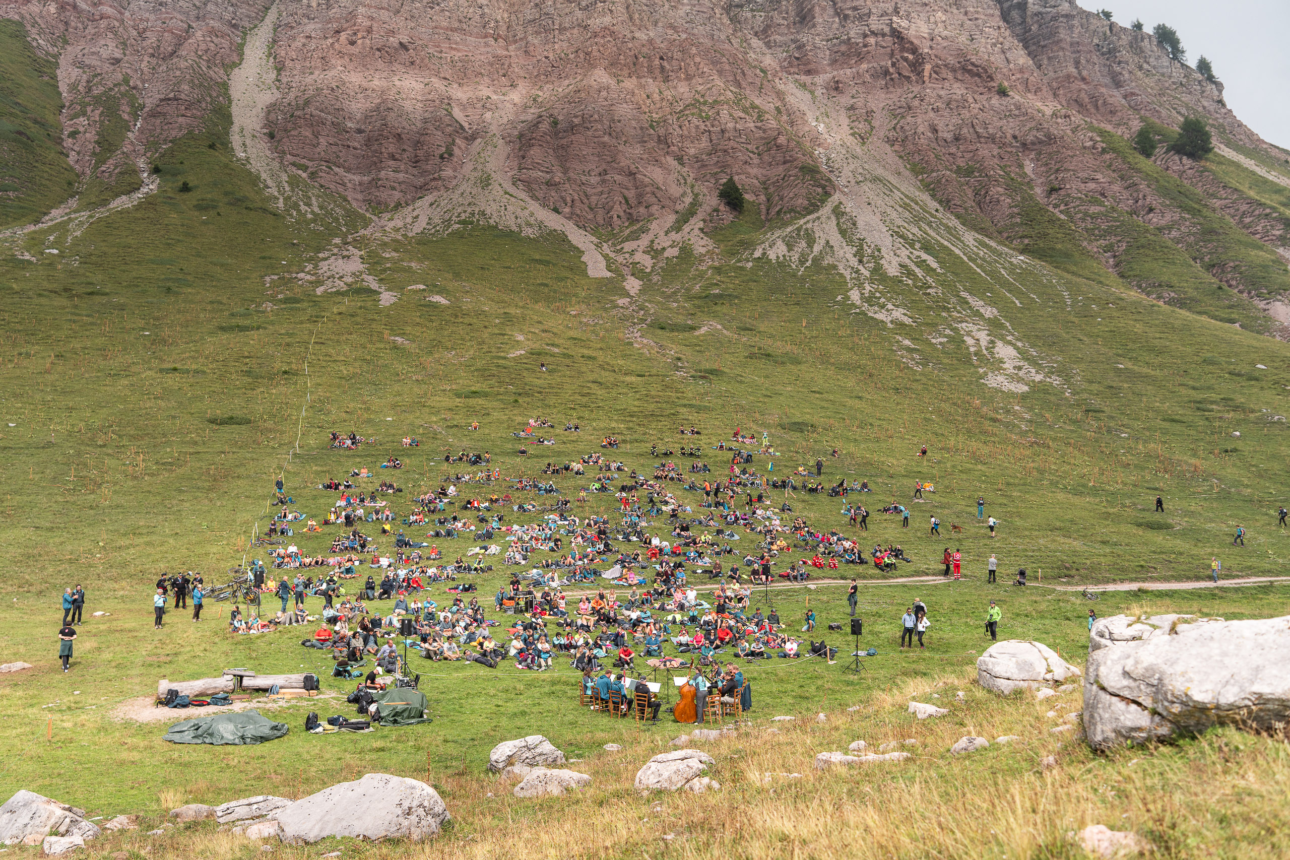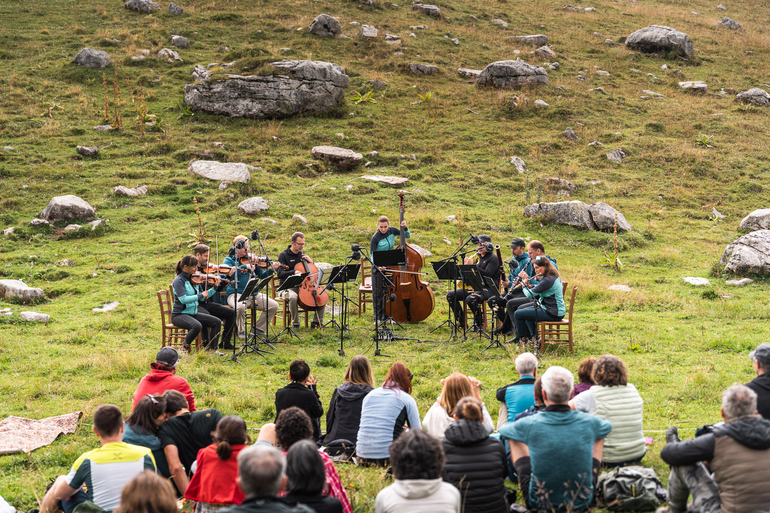 Si percepiva un’atmosfera di grande festa oggi, attorno a malga Tassulla, ai piedi del Monte Peller nelle Dolomiti di Brenta, dove a mezzogiorno ha preso il via l’edizione del trentennale del Festival I Suoni delle Dolomiti. E il popolo dei Suoni non ha mancato l'appuntamento colorando i prati del Pian de La Nana, trasformato per l'occasione dal Theophil Ensemble Wien in una frizzante sala da ballo. Dove le note di walzer, polke e marce firmate Strauss hanno danzato fra fiori e fili d'erba rincorrendosi sulle praterie dolomitiche, portate in alto nella brezza per confondersi tra i vapori in movimento.