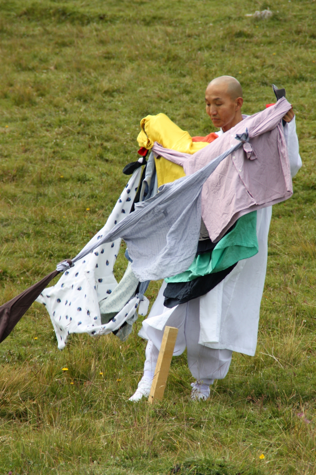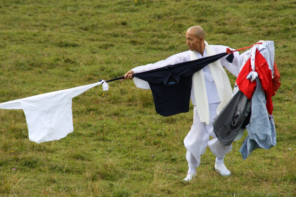 Lasciati i suoni del Seicento c'è stato invece spazio per un'altra origine, quella senza tempo della musica coreana e dal forte sapore orientale che Brunello ha eseguito mentre il danzatore Yong Min Cho ha cominciato a esibirsi. Vestito tutto di bianco ha lentamente aperto un grande involucro di tela gialla per trarne decine di camicie e maglie annodate una all'altra che ha disposto sul prato. Lì, lungo questa linea colorata, simbolico ponte tra culture diverse Yong Min Cho ha danzato abbandonando il proprio corpo ai movimenti essenziali e ieratici di movimenti senza tempo: il Sanjo coreano. Quasi a significare che però quei vestiti erano anche altro, ossia simbolo di molteplicità e anche di assenza, il danzatore ha imbracciato un tamburo per lanciare con colpi singoli, intervallati da lunghi silenzi, una sorta di appello che forse era rivolto a chi ha tentano l'arrivo in occidente da profugo senza però riuscire a compiere il proprio viaggio fino in fondo.