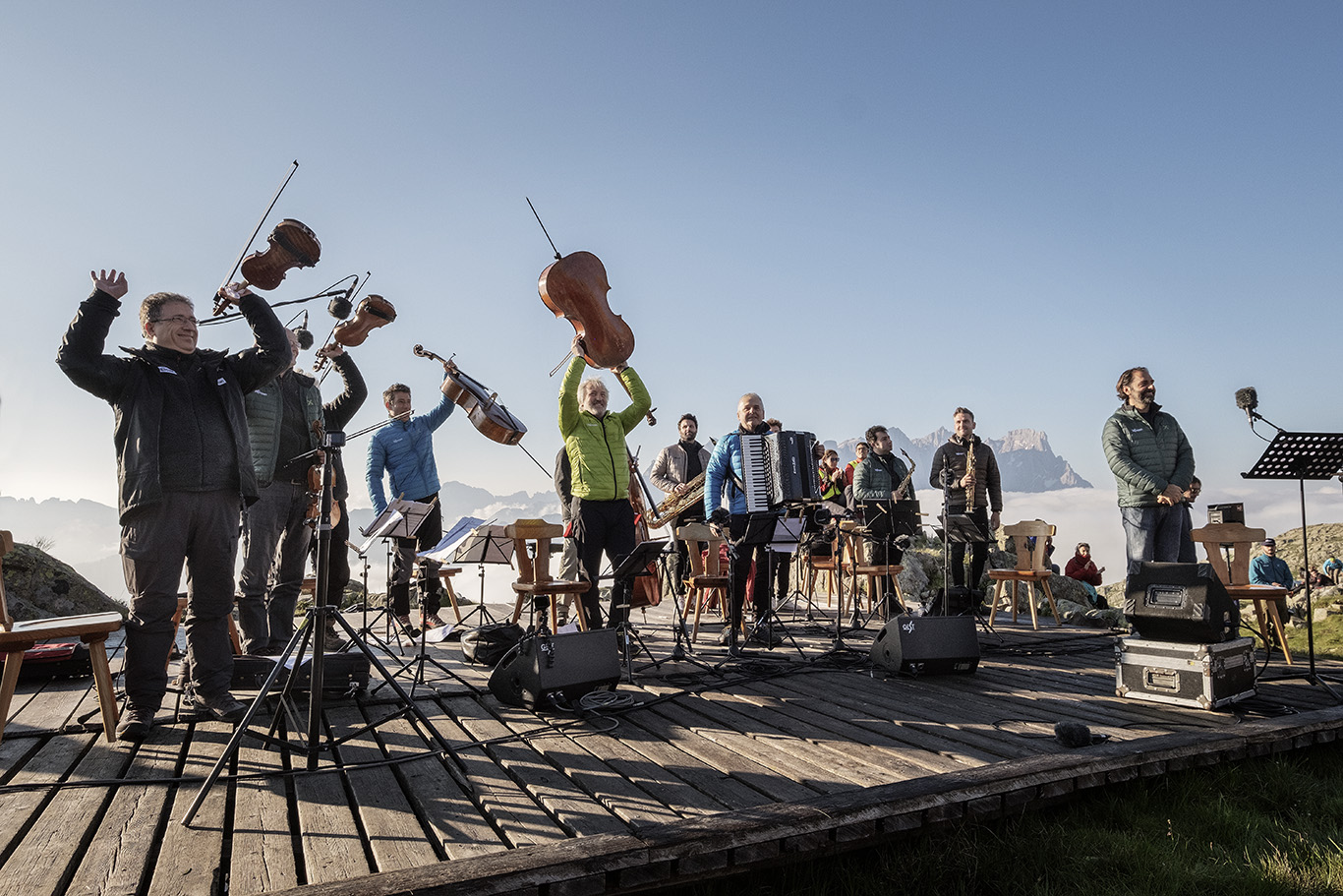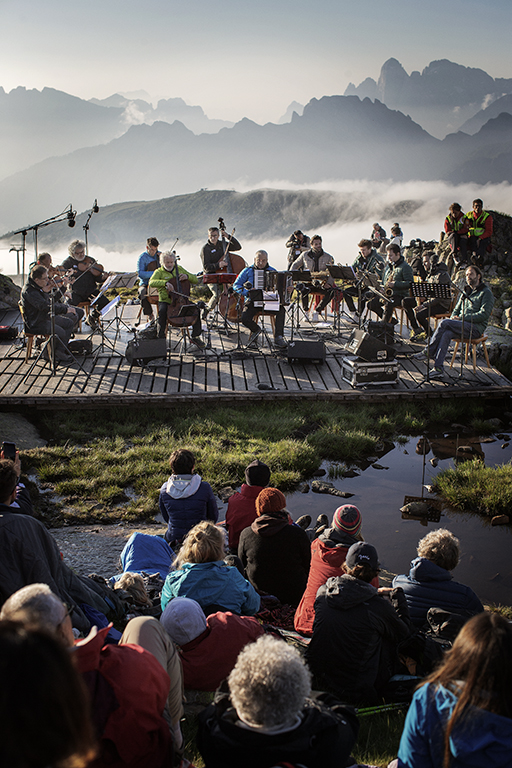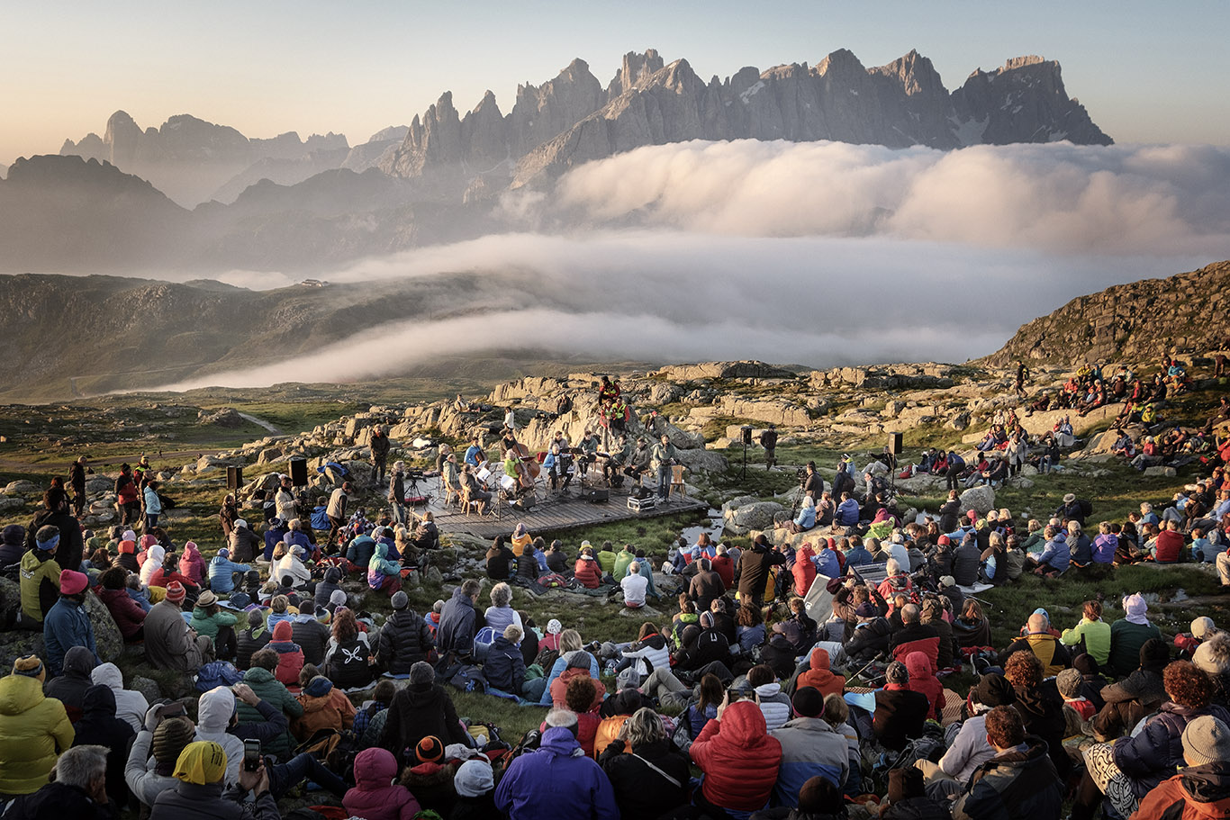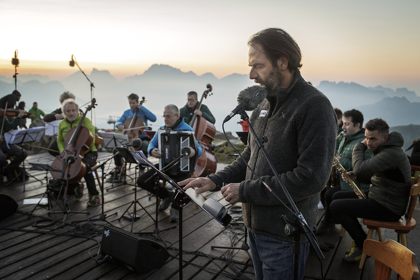 “E intanto si suona”, il racconto corale e orchestale di Mario Brunello e Alessandro Baricco ispirato dai diari di guerra del musicista Alessandro è andato oggi in scena sul Col Margherita davanti a 3500 spettatori nello scenario delle vette dolomitiche alle prime luci del giorno e subito replicato per il numerosissimo pubblico salito in quota