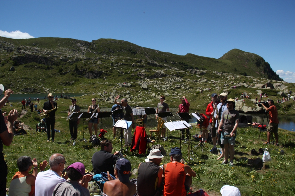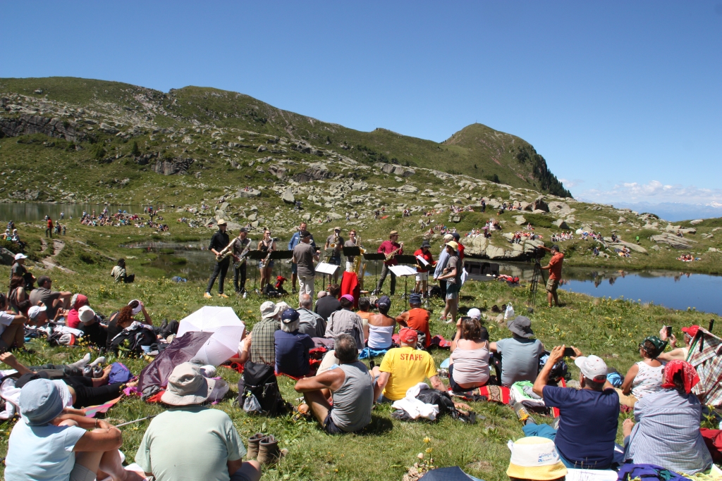 Una giornata splendida di cielo terso con le poche nubi e i pascoli riflessi nell'acqua degli specchi d'acqua di origine glaciale, e ancora i tanti colori dell'abbigliamento del folto pubblico salito alla quota di oltre 2200 metri che faceva da contraltare ai rododendri. Tutto questo ha fatto da sfondo a un viaggio nella musica del Novecento. A condurre le danze il maestro Milan Turkovic che dopo l'inizio travolgente della “Slavonic Dance” di Antonin Dvorak ha giocato - supportato dai suoi musicisti - col pubblico presentando i vari tipi di saxofono presenti dal sopranino al basso, dal soprano al soprano alto fino al baritono e al sax tenore. E ogni strumento interpellato ha regalato una breve improvvisazione o un gioco sonoro. Si è tracciata così la traiettoria che avrebbe percorso il concerto sospeso tra brani di grandi autori, libertà intepretativa e grande interazione col pubblico. Dopo Dvorak è stato il turno di Shostakovic e la sua "Jazz Suite n. 2".