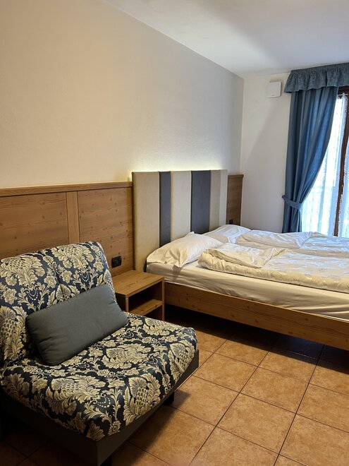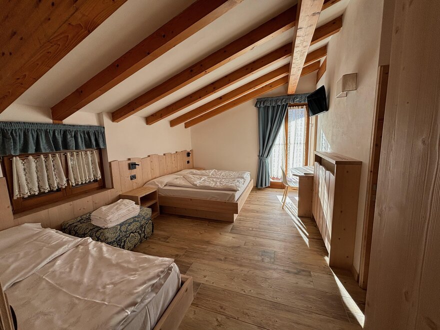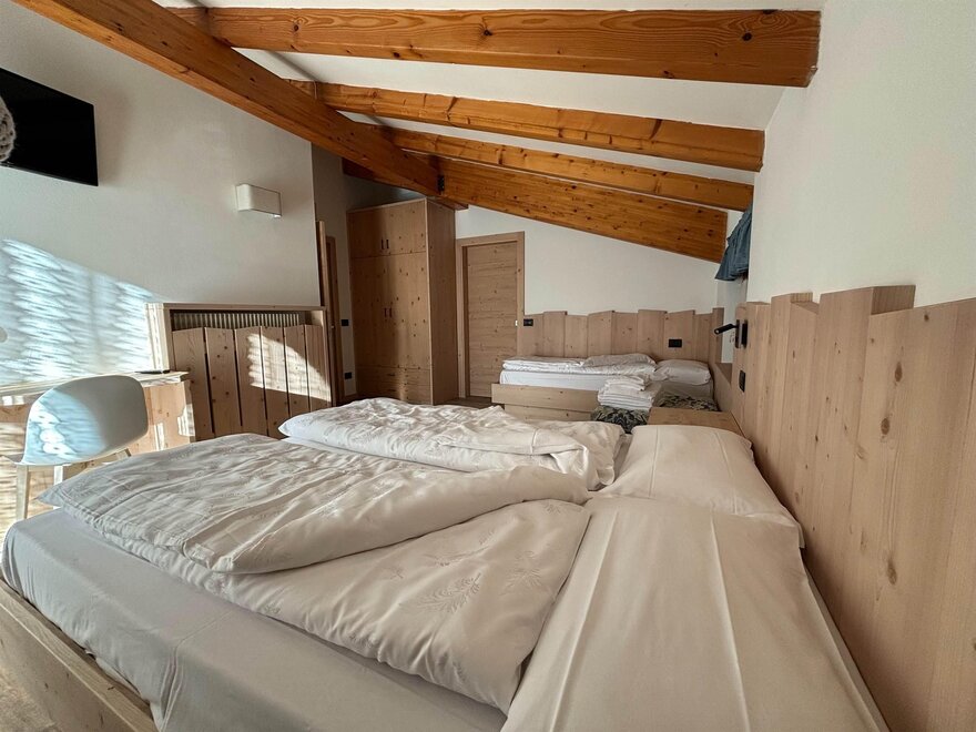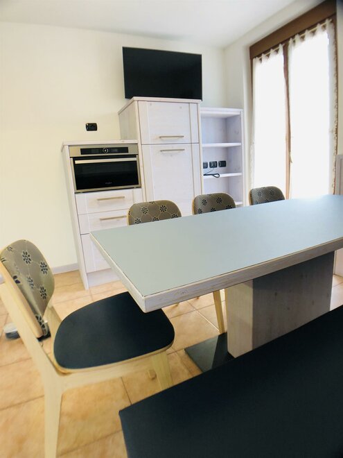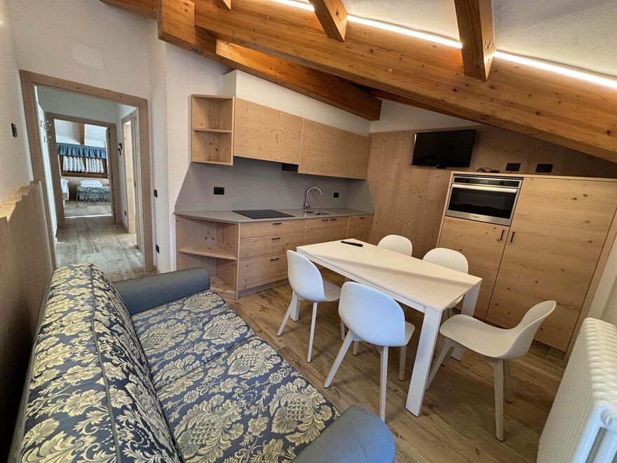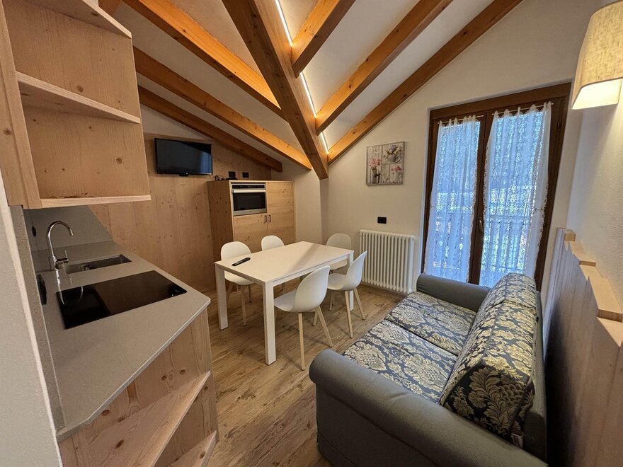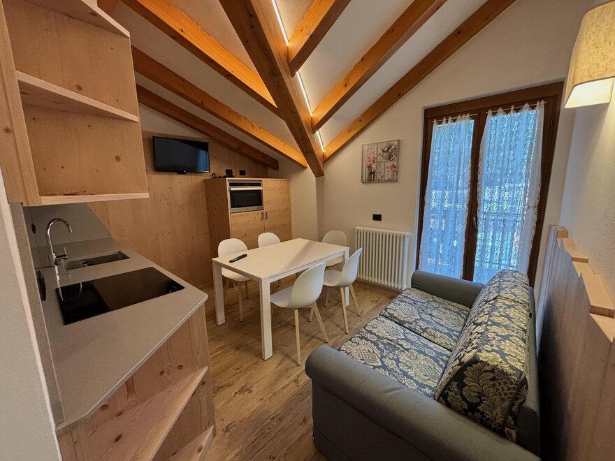 Comfortabele zolderdriekamer bestaande uit twee kamers (ideaal voor 5/6 personen), woonkamer met kitchenette en twee badkamers (ook functioneel voor mensen met een beperking) compleet met vaatwasser, magnetron, 2 TV's, kluis, haardroger. Panoramisch uitzicht op de Brenta-Dolomieten vanaf een groot zonnig balkon.
