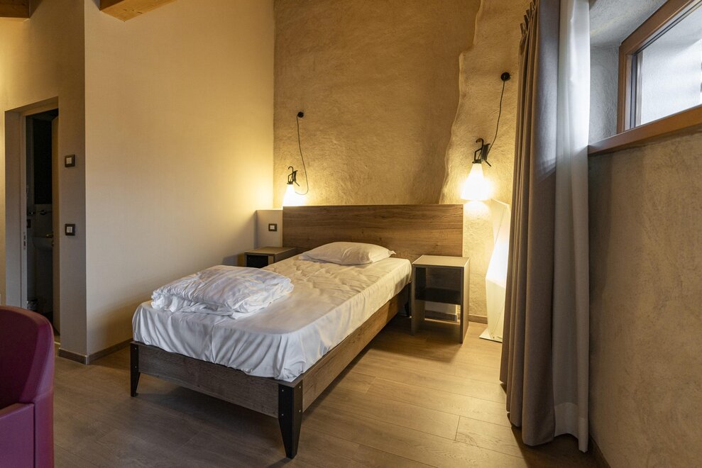 Een eenpersoonskamer, perfect voor solo-reizigers die op zoek zijn naar een intieme en functionele omgeving, compact maar gezellig, biedt alles wat nodig is voor een comfortabel verblijf met een eenpersoonsbed, verzorgde meubels en goed georganiseerde ruimtes.