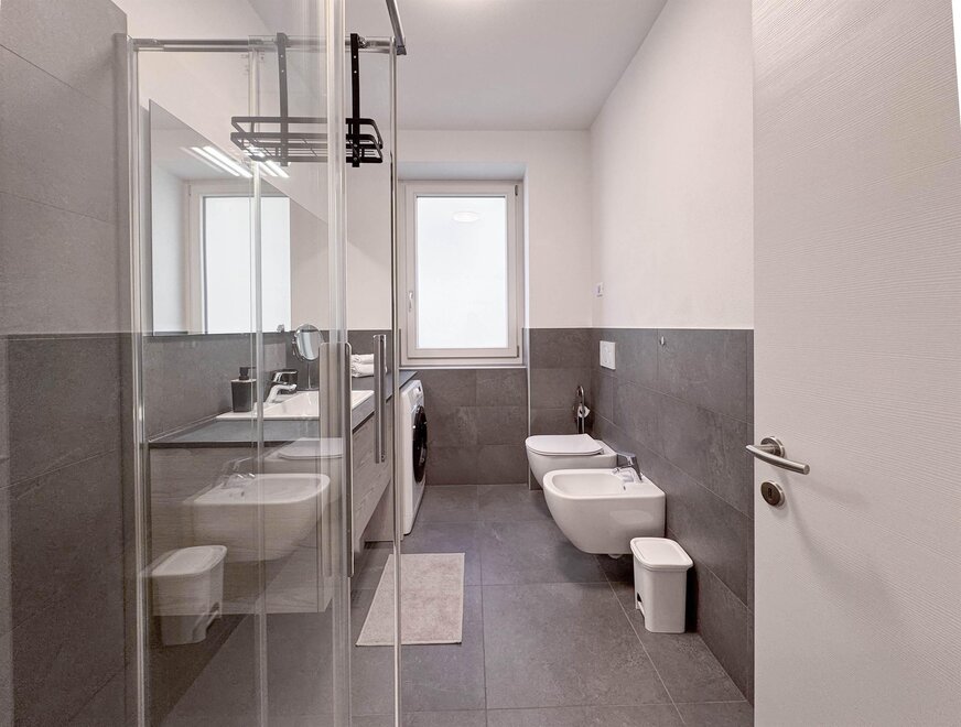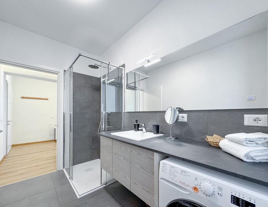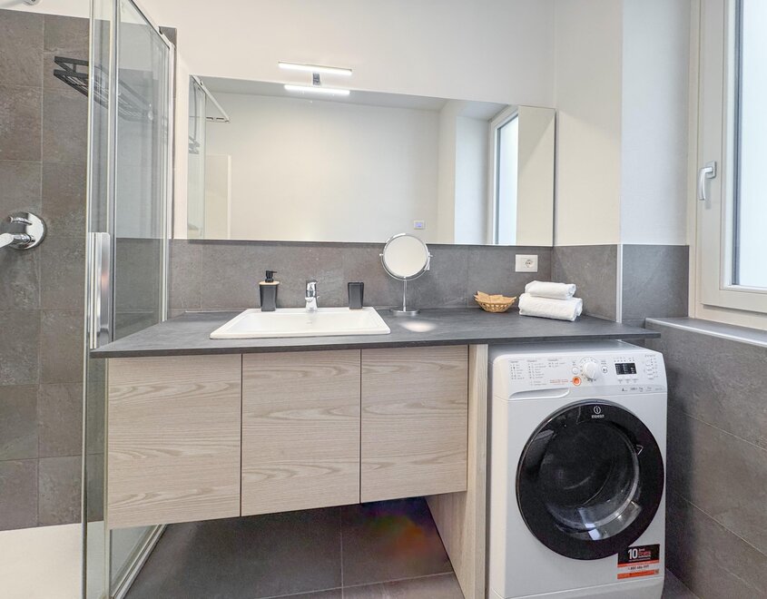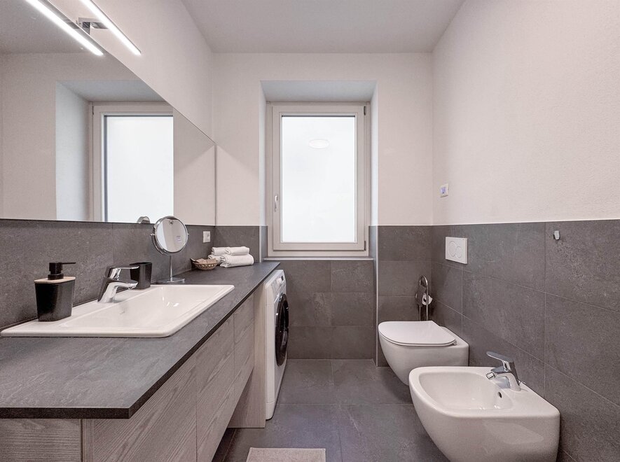 De ruime badkamer met ramen valt op door de grote douche met een verlaagd profiel, de afwerking van het meubilair en de aanwezigheid van een wasmachine-droger.Kenmerken kamer/appartement