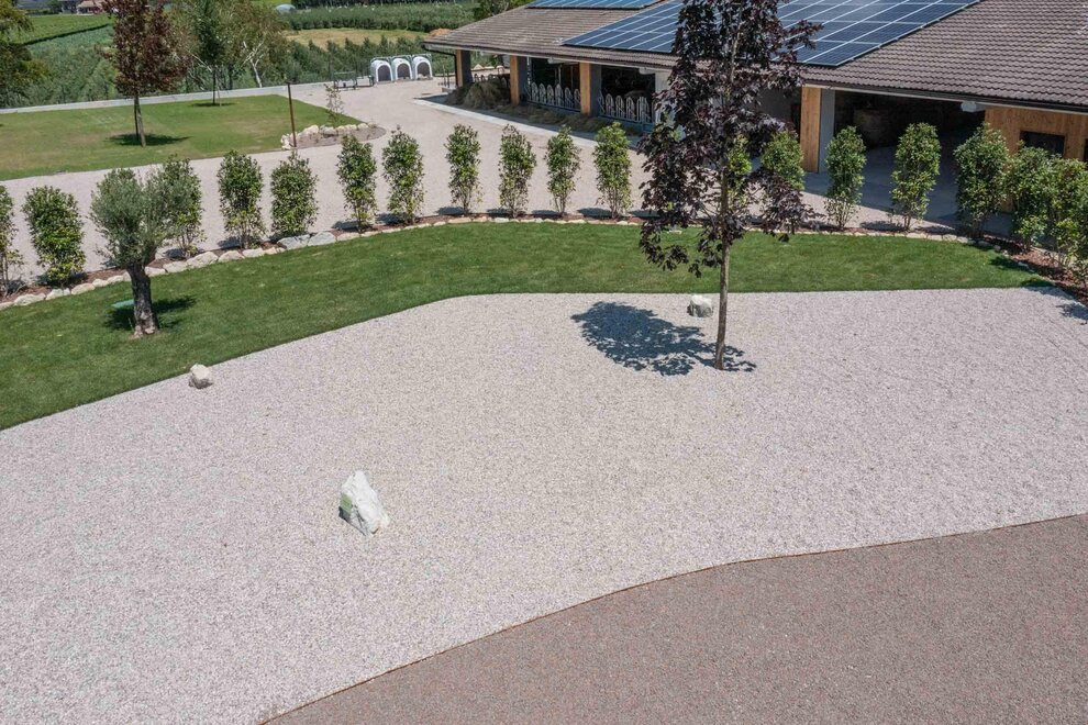 - Przednią strefę pokrytą żwirem o długości 7 metrów, gdzie możesz zaparkować swój pojazd (pojazdy do 8 m)