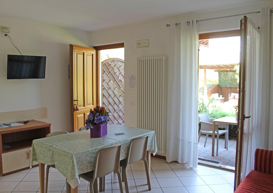 Mieszkanie dwupokojowe na parterze składające się z salonu z aneksem kuchennym i sofą, sypialni małżeńskiej z widokiem na ogród z szafą i łazienką.Wyposażenie pokoju