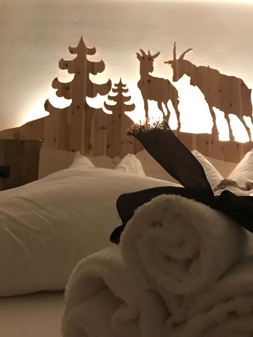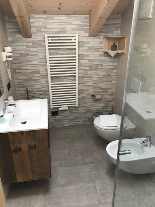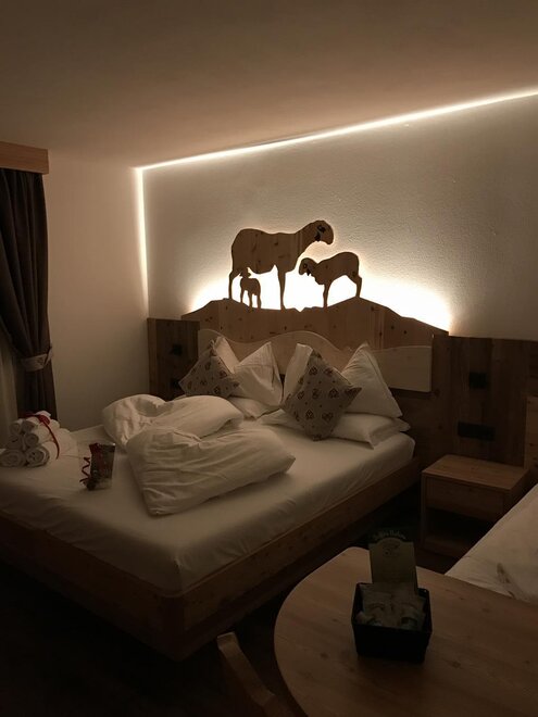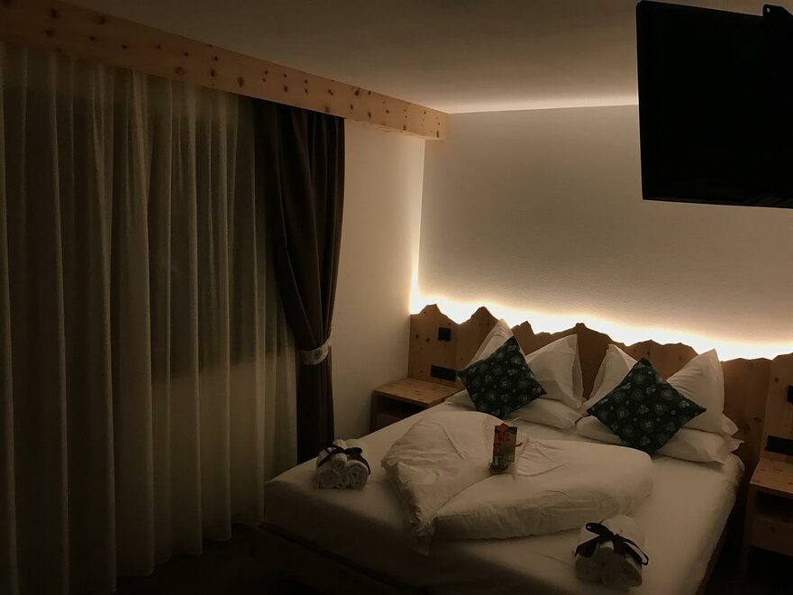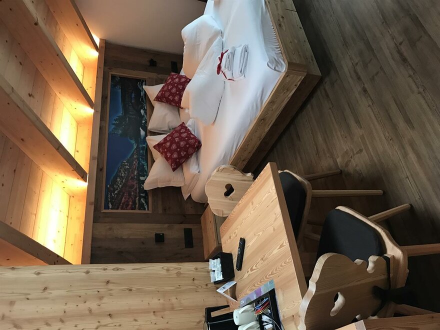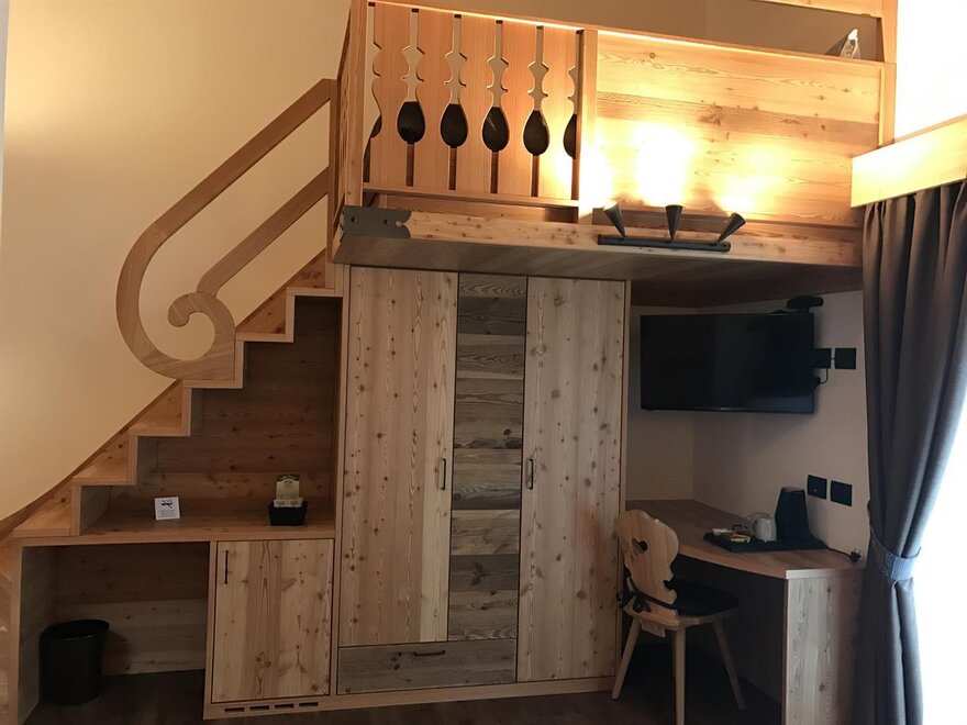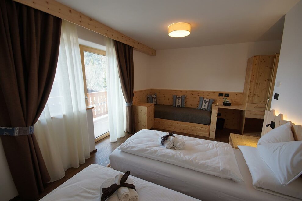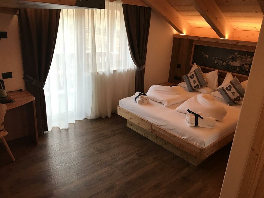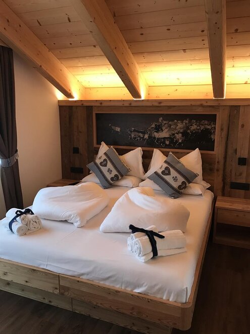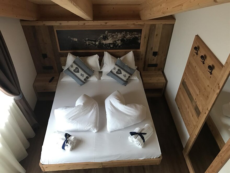 Pokoje są całkowicie wykonane z drewna typowego dla naszej Doliny Fiemme: głównie modrzewiowego i cirmolo. Ich naturalny zapach i ciepło będą towarzyszyć Twoim snom i chwilom relaksu, sprawiając, że poczujesz się otulony przytulną atmosferą gór, która nas otacza.