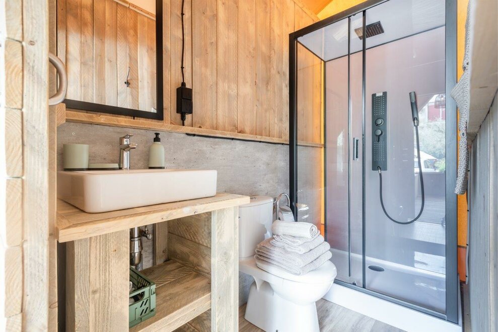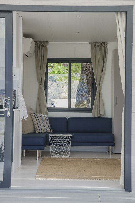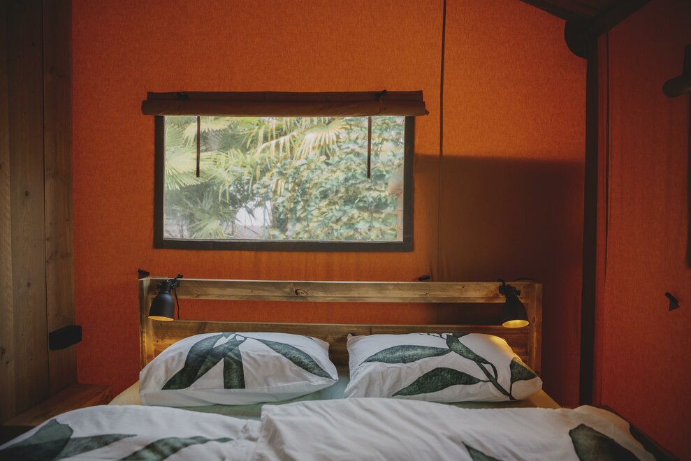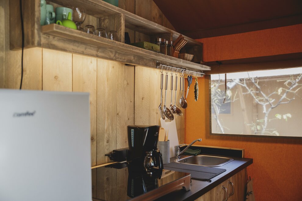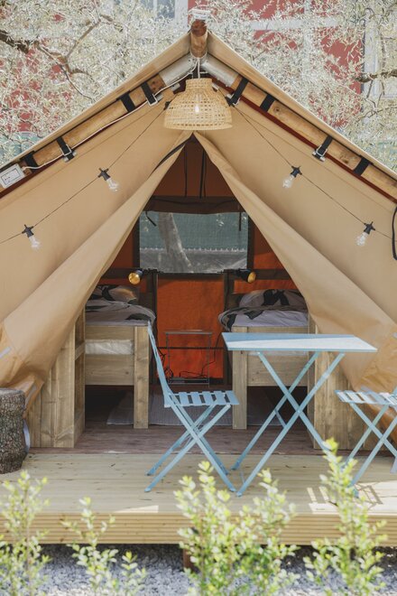 Przestrzeń mieszkalna wewnątrz namiotu jest dobrze zorganizowana na noc, wyposażona jest w dwa pojedyncze łóżka oraz małą komodę. W namiocie nie ma ani łazienki, ani aneksu kuchennego, goście mają swobodny dostęp do toalet na kempingu, a śniadanie wliczone jest w cenę.Na zewnątrz znajduje się mały taras o powierzchni ok. 3 m² z 2 krzesłami i stolikiem do relaksu.