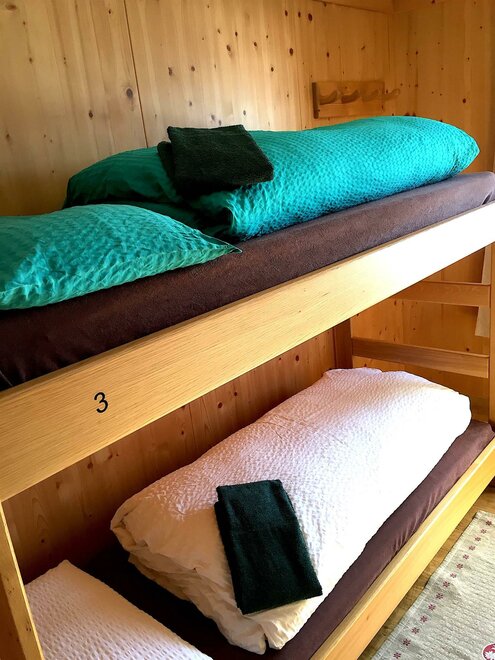 Pokój jest wyposażony w trzy łóżka piętrowe; dostarczane są puchowe kołdry z całym pościelą - prześcieradłami na materac, pokrowcami na kołdry - oraz poduszki z poszewkami i ręcznikami do twarzy. Wliczone w cenę półpensjonat.