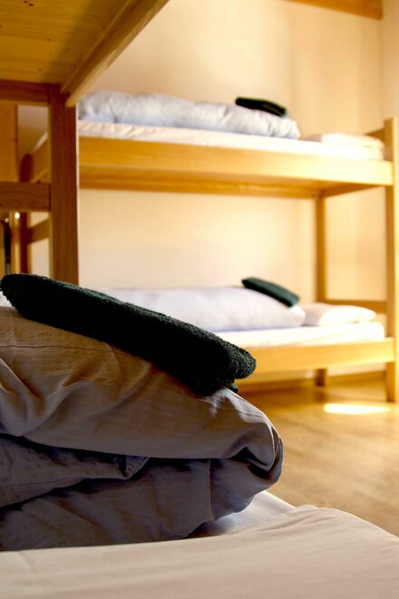 Pokój jest wyposażony w trzy łóżka piętrowe i jedno łóżko pojedyncze; zapewnione są kołdry z puchu gęsiego wraz z całą pościelą - prześcieradłami, poszwami na kołdry - a także poduszki z poszewkami i ręczniki do twarzy. Wliczone w to jest wyżywienie półpensjonatowe.