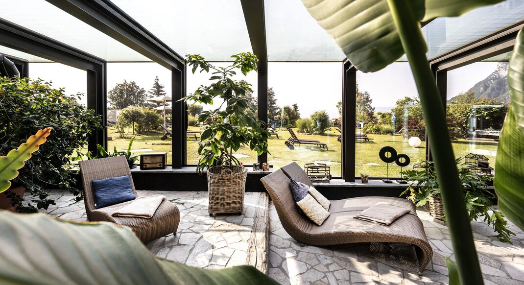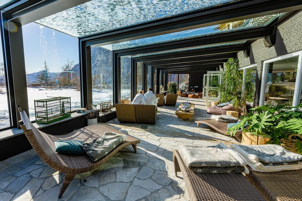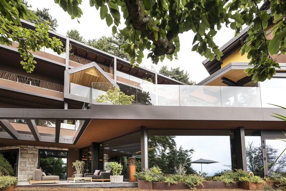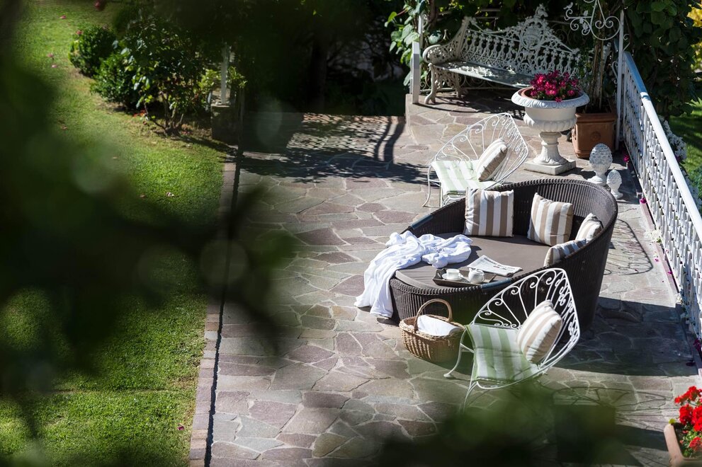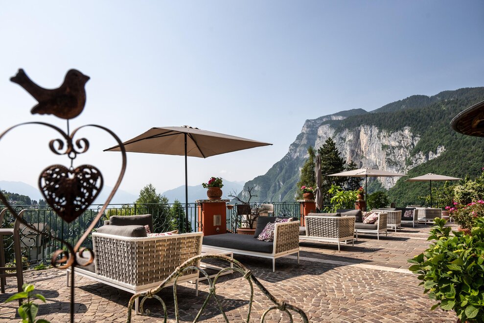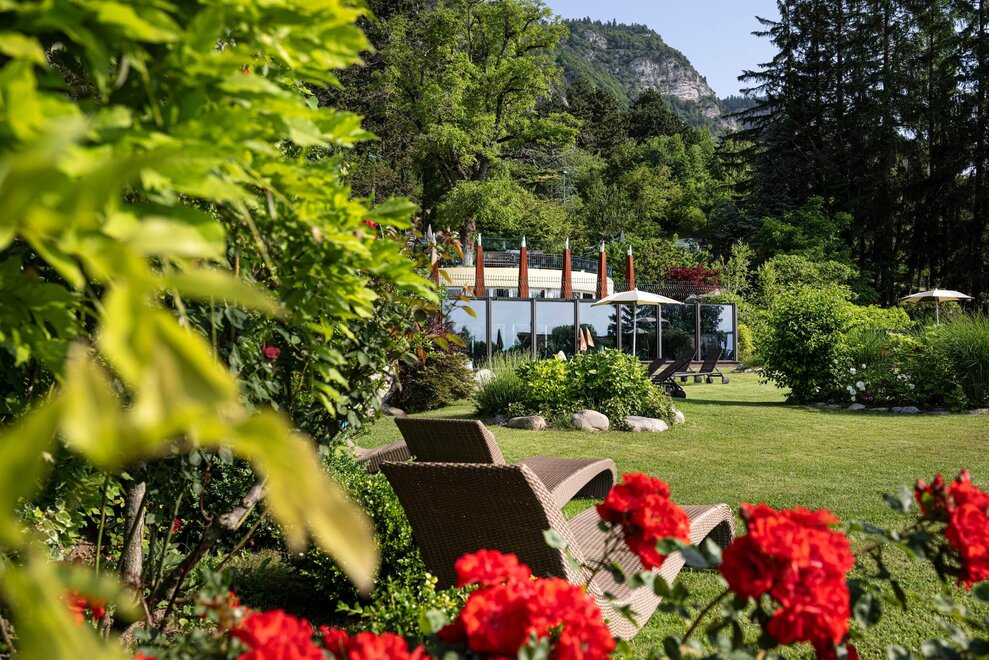 The hotel is surrounded by large terraced flower gardens, featuring elegant outdoor lounges, sunbeds and relaxing areas where guests can enjoy the peaceful atmosphere and the beautiful mountain views.