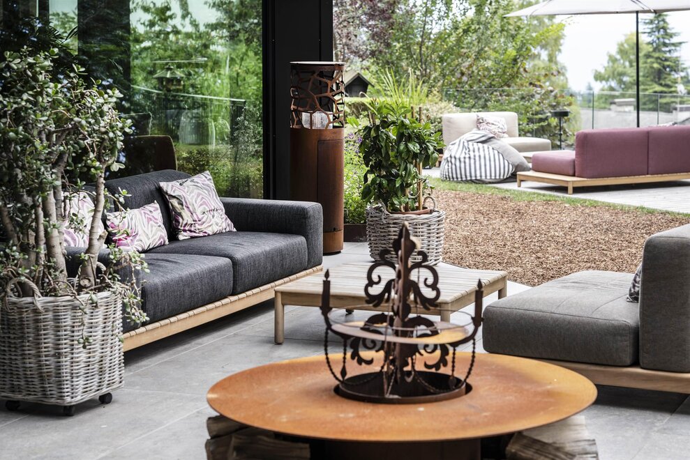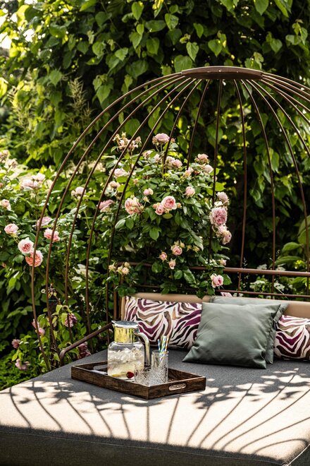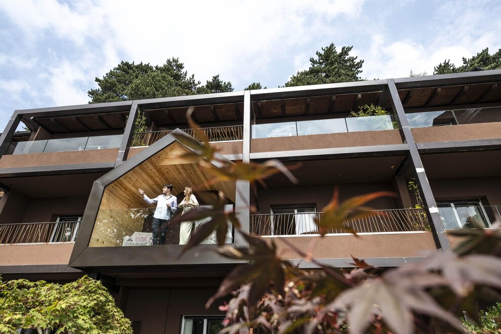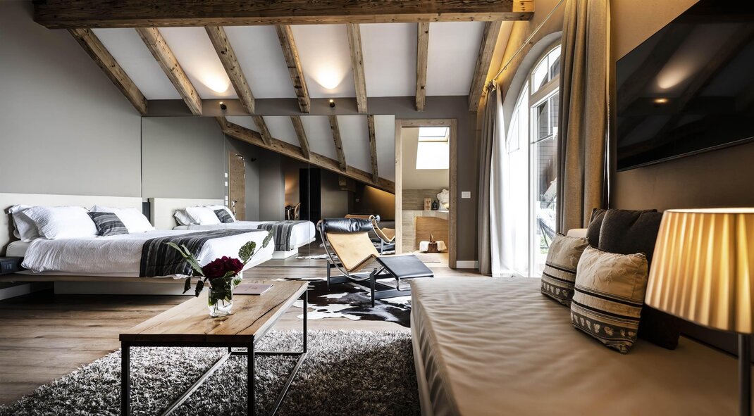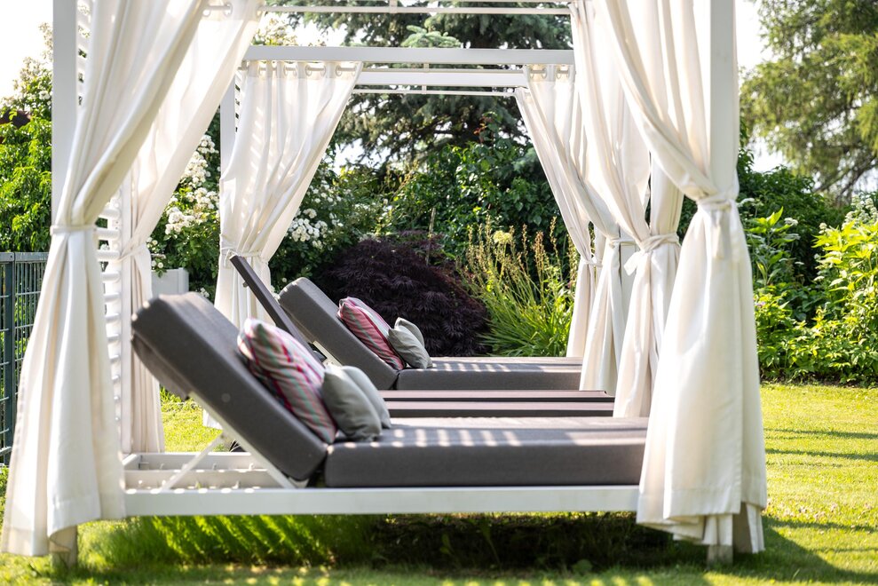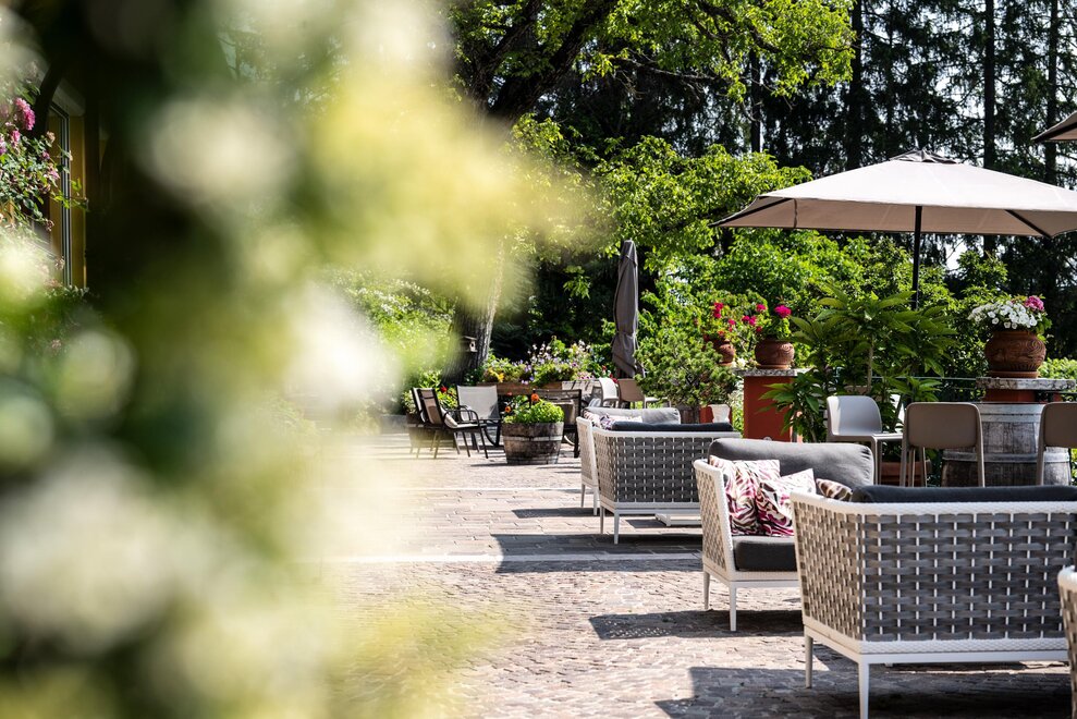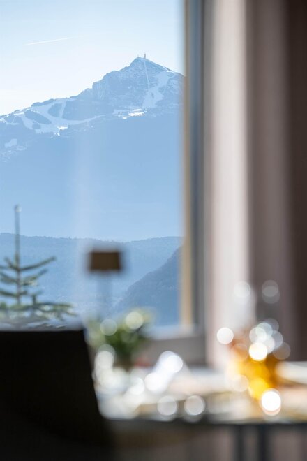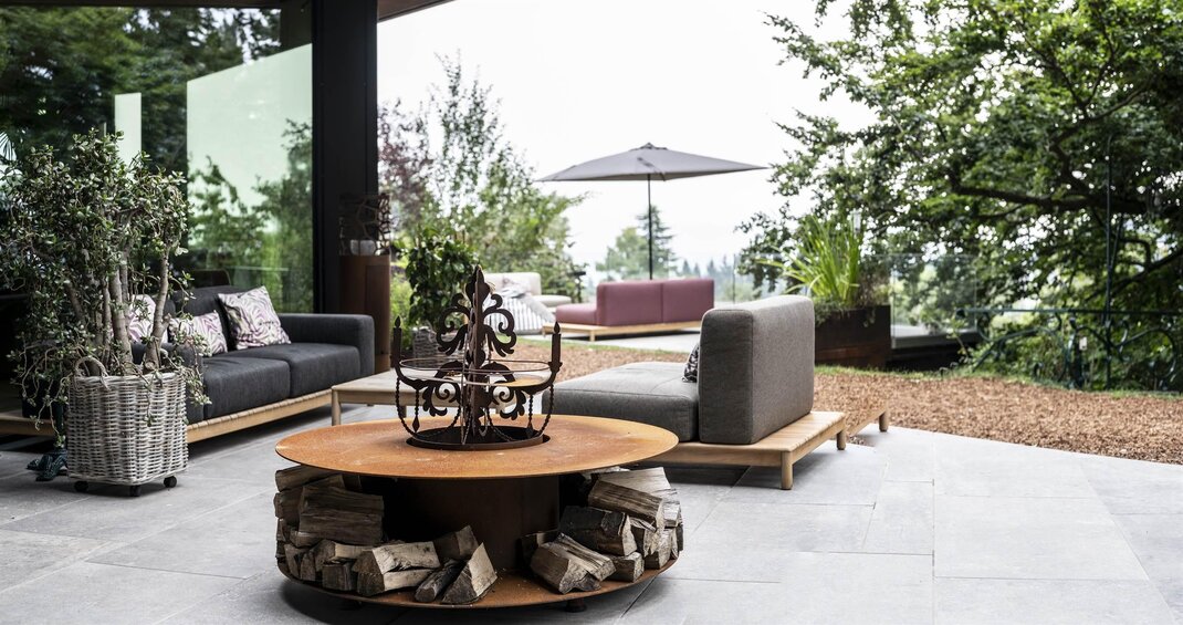The hotel is surrounded by large terraced flower gardens, featuring elegant outdoor lounges, sunbeds and relaxing areas where guests can enjoy the peaceful atmosphere and the beautiful mountain views.