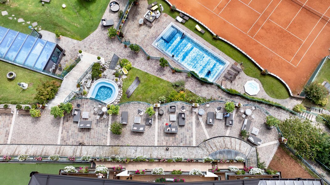 The hotel park also offers many opportunities for sports and outdoor activities: three clay tennis courts, a covered padel court, a synthetic grass five-a-side football field, table tennis and e-bikes available for guests. During the week the hotel organizes guided activities such as Nordic walking, aqua fitness, nature walks and yoga sessions in the bioenergetic garden.