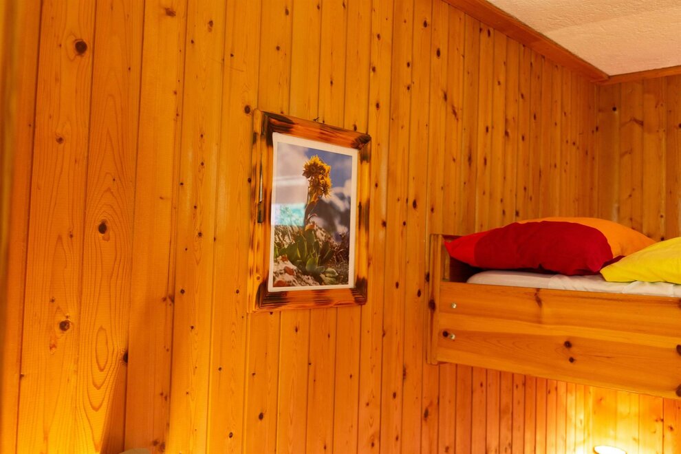 Jak w typowym stylu tyrolskim, pokój jest całkowicie wykończony drewnem świerkowym.